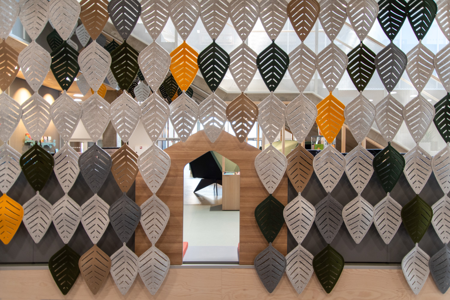 Airleaf makes it possible to create separate areas and a pleasant soundscape while preserving the room’s openness. You determine the degree of openness yourself by choosing how the leaf-shaped modules are combined. The leaf-shaped modules can be combined into sound-diffusing screens in a variety of patterns and formats.