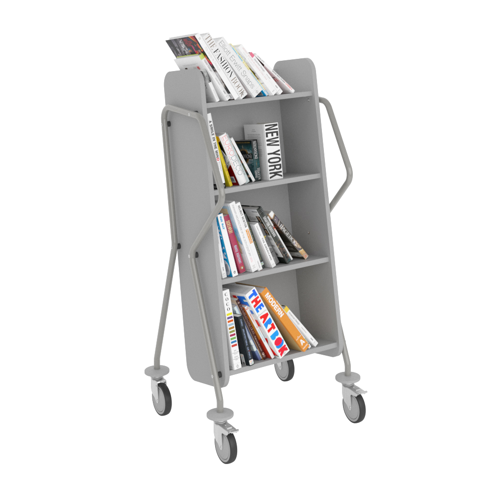 Ergonomic, user-friendly, single-sided book trolley with 4 shelves. Generous amount of clearance between shelves to accommodate larger books.