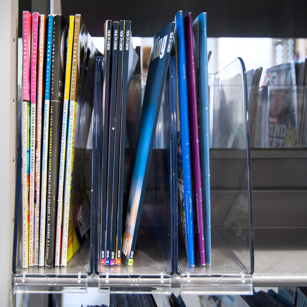 Practical periodical collector with stopper. Holds the periodical collector in place while the stopper can be used for signs/labels.