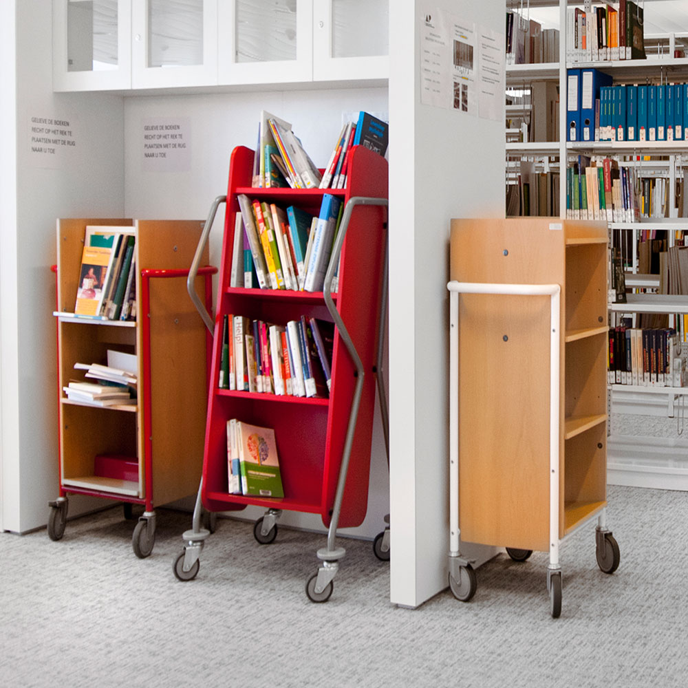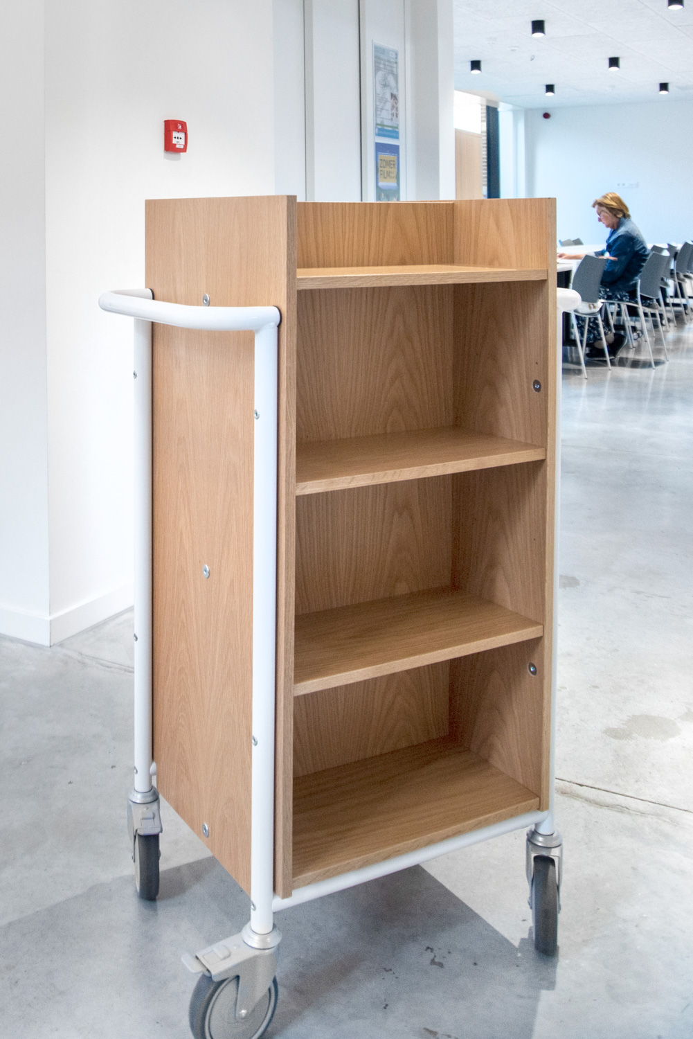 This book trolley can be used as a mini shelving system that can be moved around in the library where needed.
