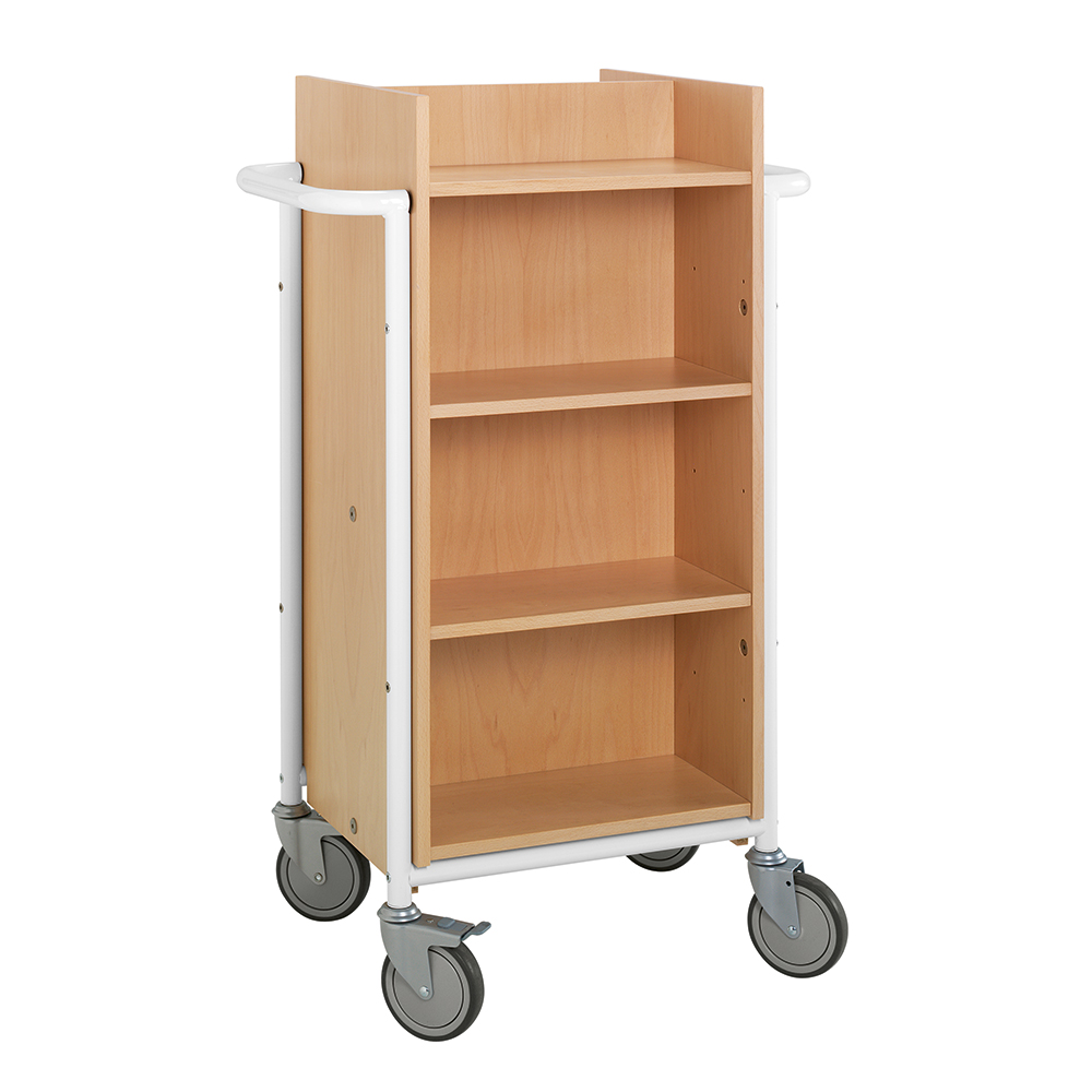 Functional, double-sided book trolley with 8 shelves. 6 shelves are adjustable to accommodate various media sizes.