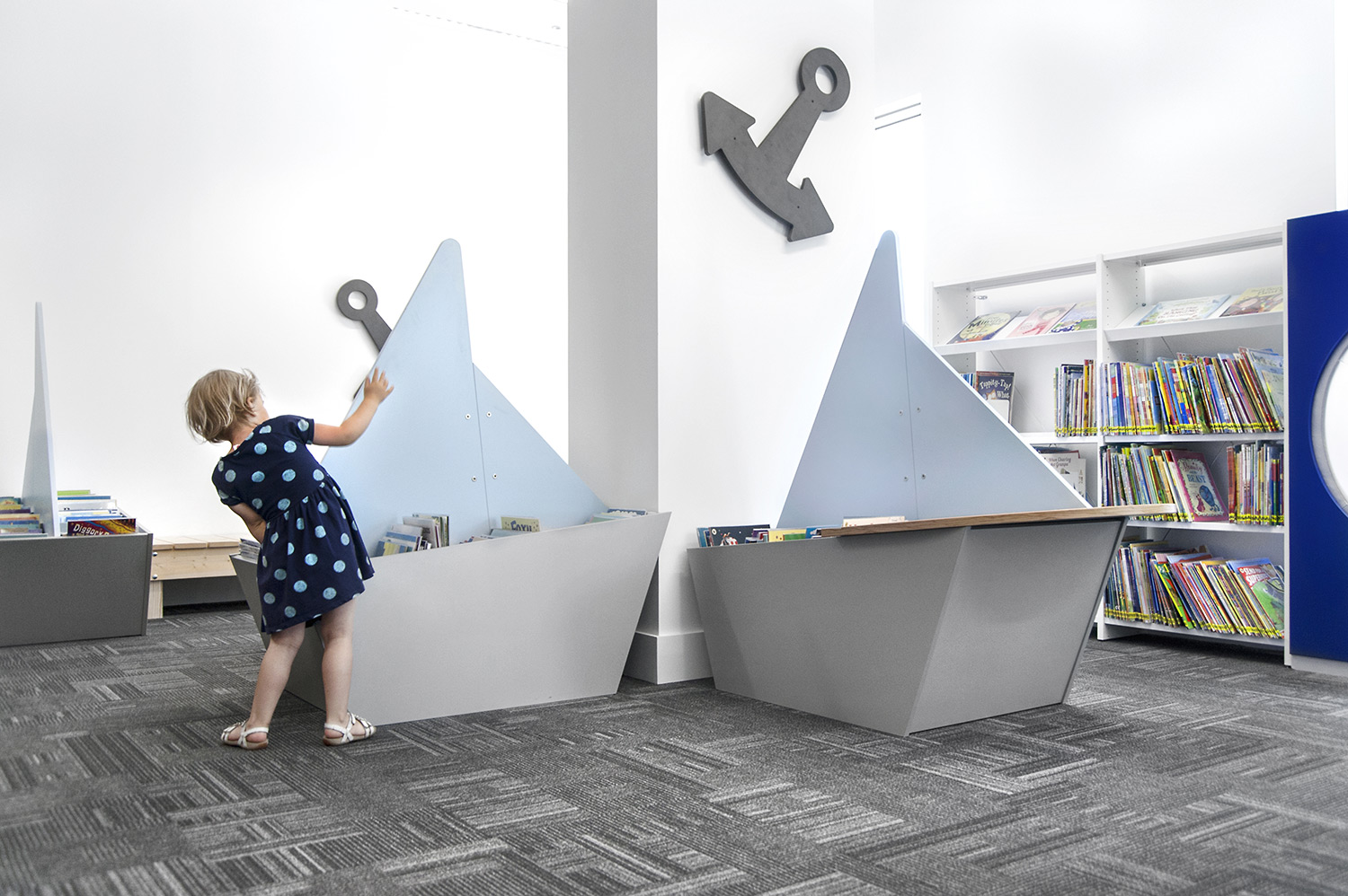 Bottom: 60/30 round steel shelving compliments the straight shelving used throughout the library.