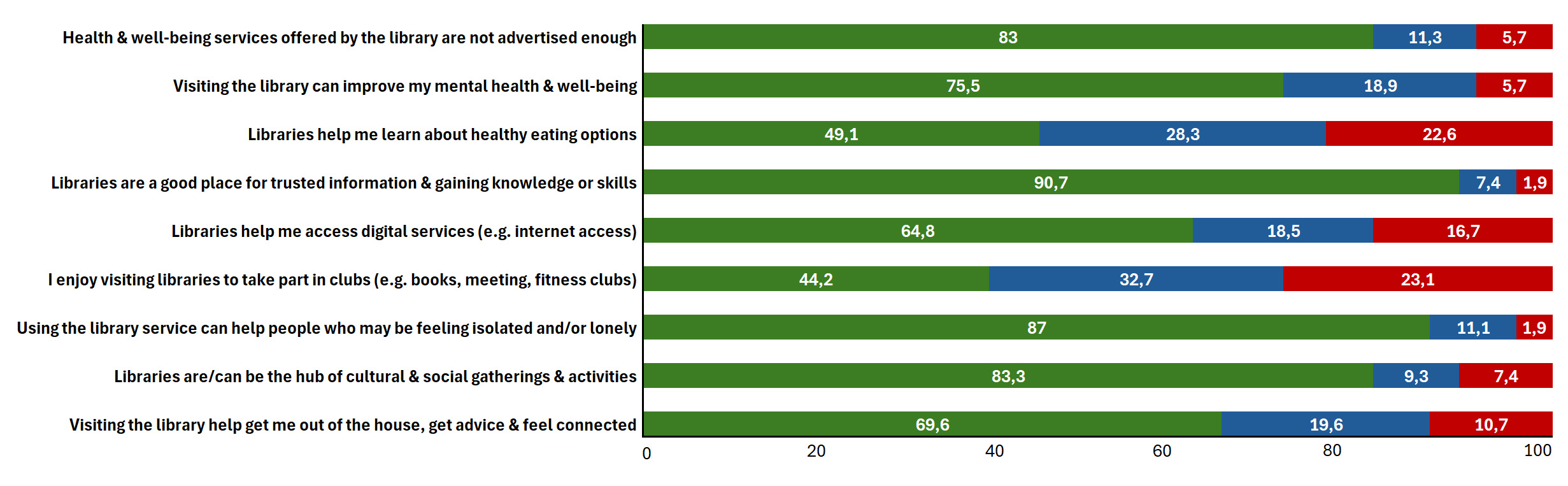 UK Survey with agreement levels to statements regarding how public libraries could impact the health and wellbeing of service users and the community.