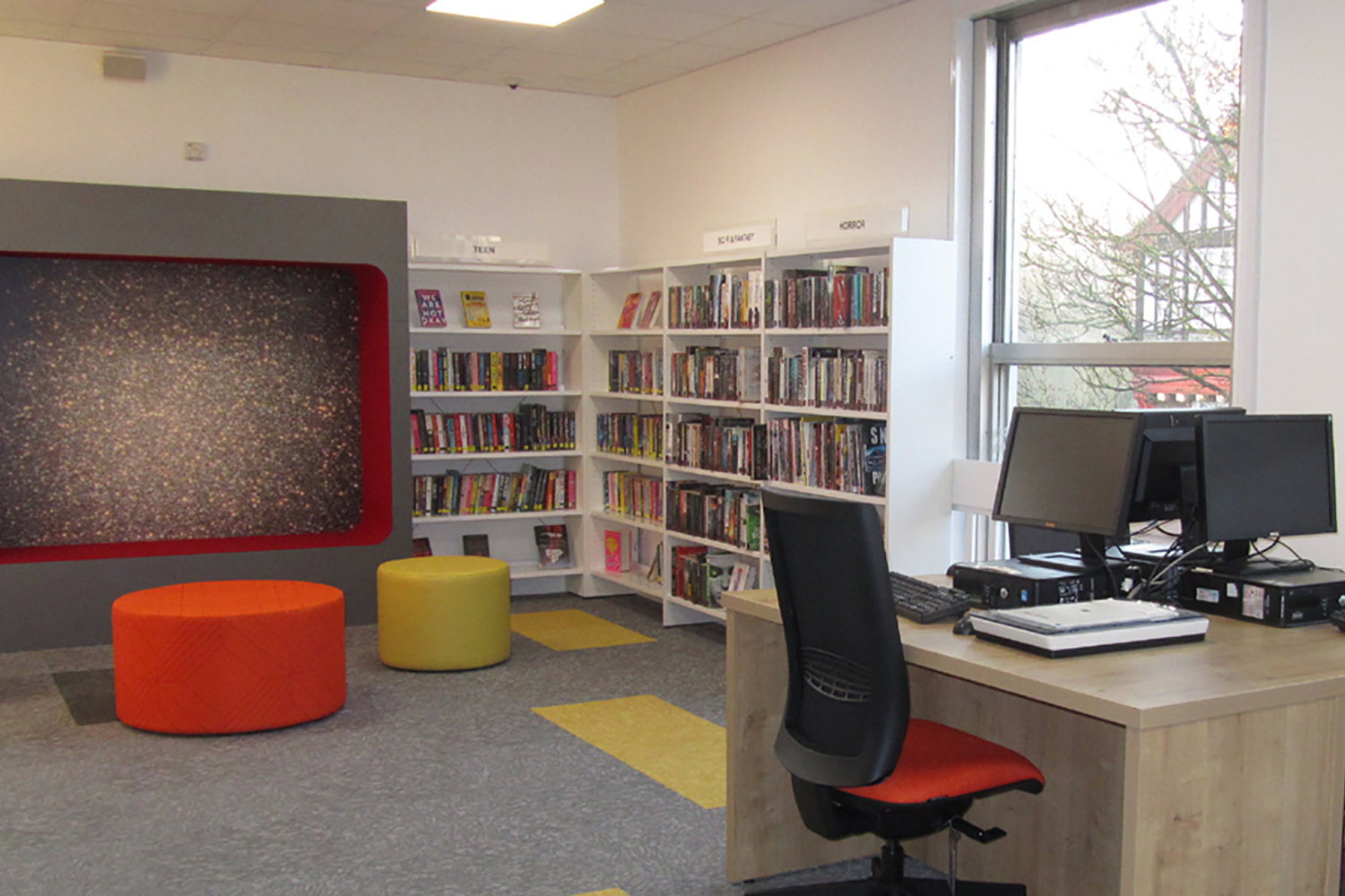 In commemoration of the moon landing which took place in 1969- the same year Newport Pagnell Library opened- the Children’s library features a colourful rocket graphic to complement the ‘reading rocket’ installed in the centre of the space.