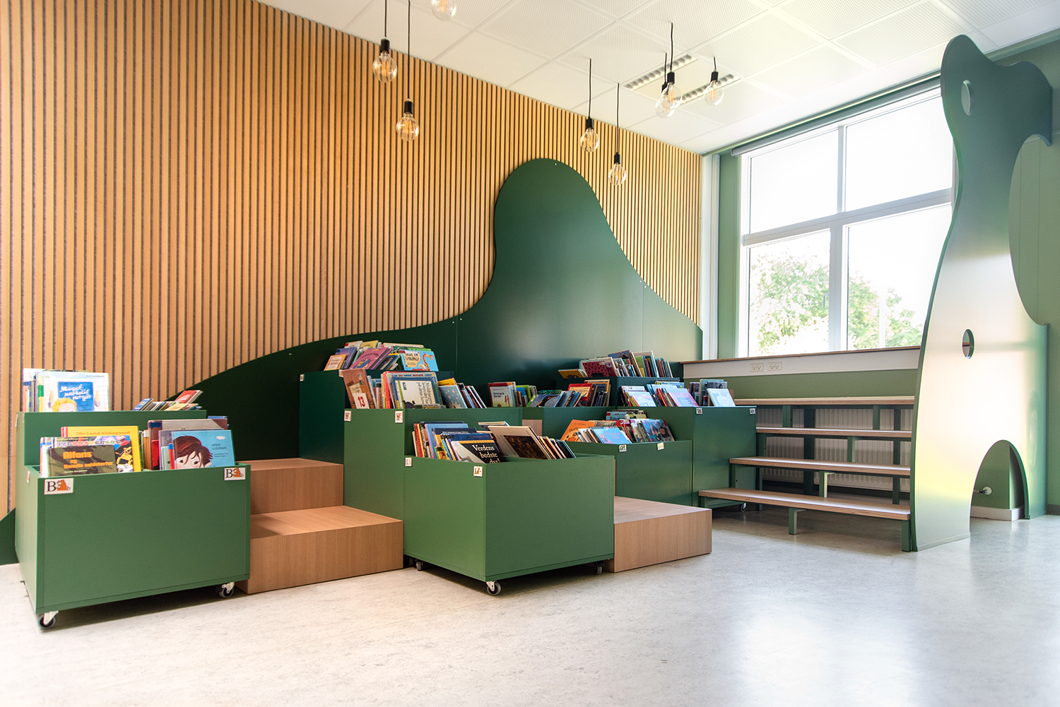 The school library is the beating heart of the school. Children of all ages are stimulated to read when the interior design is varying and playful.