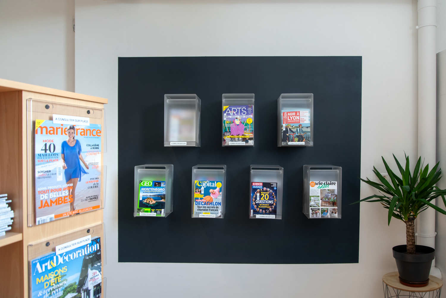 Current magazines and periodicals are stored in a compartment behind the flap (lift and insert) and the fold-down lid also serves as a display holder for the latest issues.