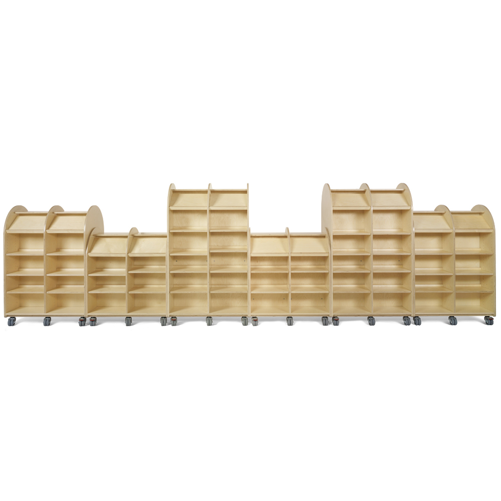 Build inspiring “urban spaces” with buildings of different heights and depths. Invite visitors on a walk around town along the building façades with inviting “display windows” full of books, magazines and much more! Ideal as focal points for all visitors.