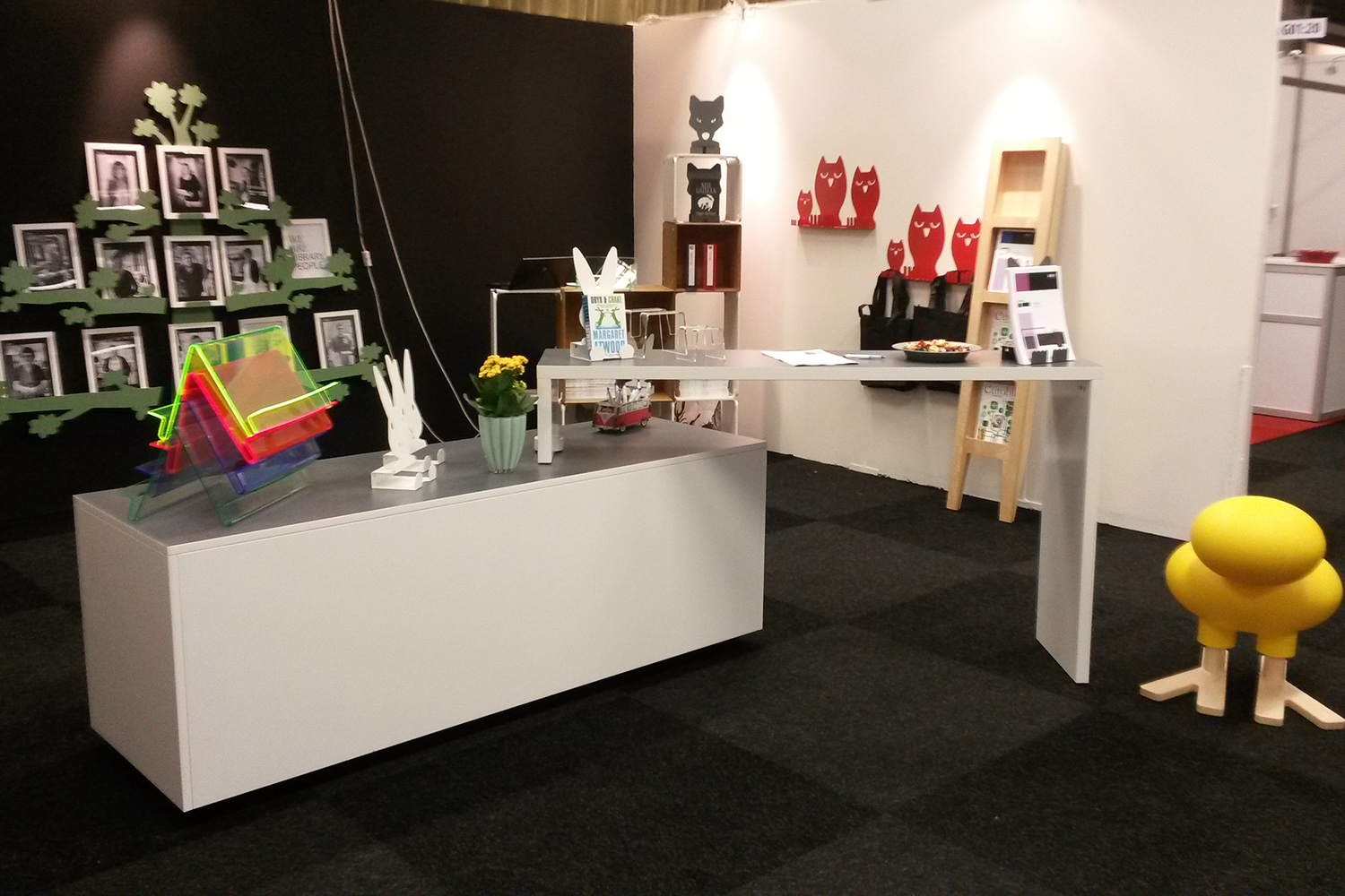 ShowIt display elements with box and bar in white with Virrvarr laminate on top served as excellent meeting and display area while Happy Bird attracted many visitors to the fair to both smile and testing to sit on.