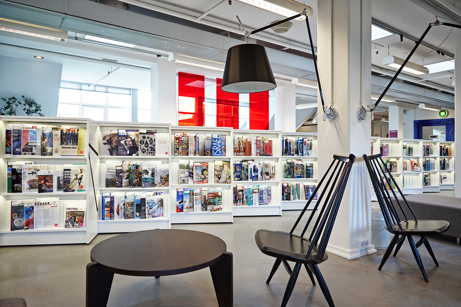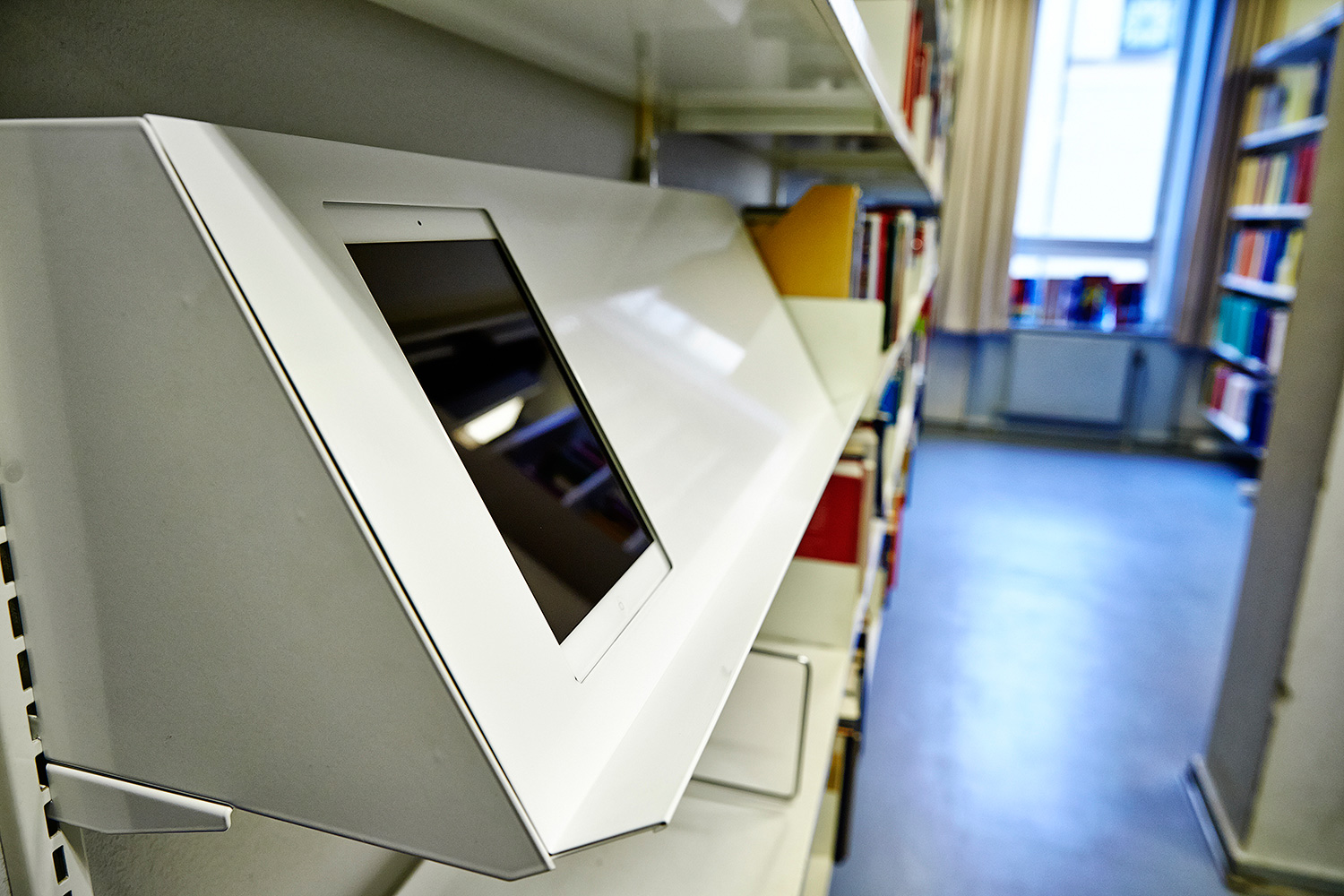 The result is a state of the art library with technology integrated into the shelving, like touch-screens in the end panels and LED lights integrated into display shelving.