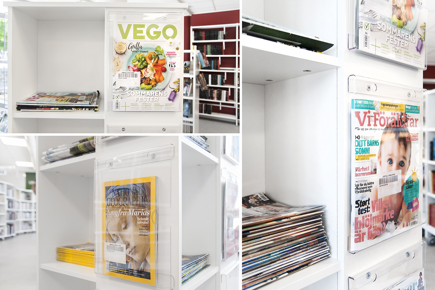 16 transparent acrylic holders provide perfect display for periodical front covers.
