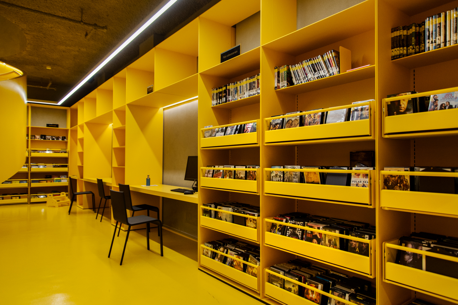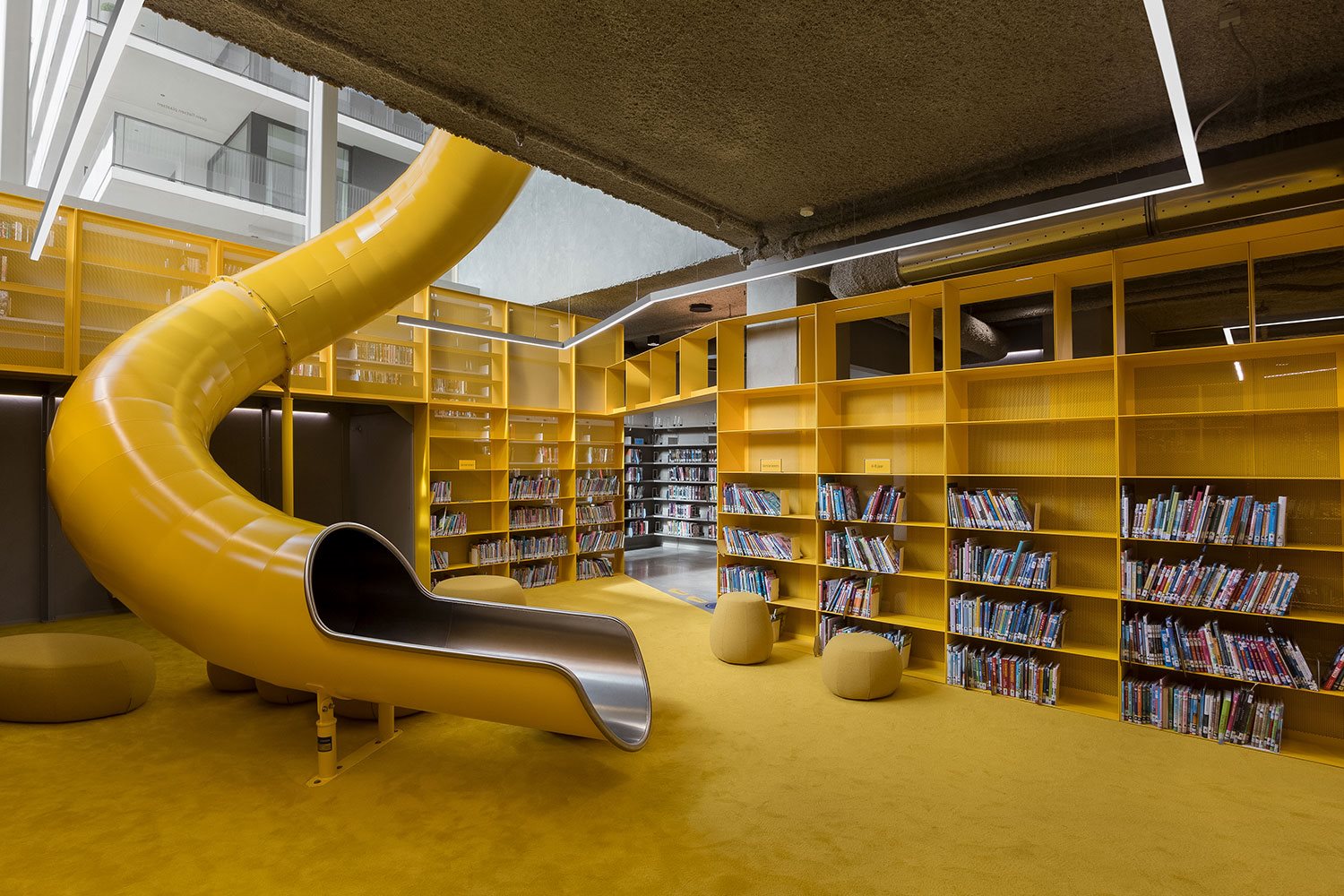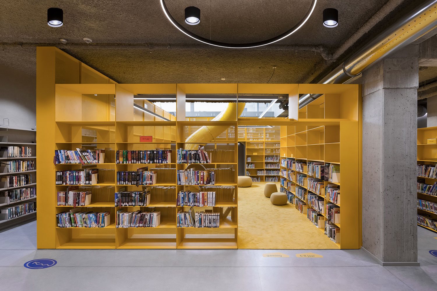 This is reflected in many ways: the library is open 12 hours a day, the youth library is accessible via a slide from the entrance hall, shelves are deliberately kept low and interspersed with cozy sitting areas and long work tables.