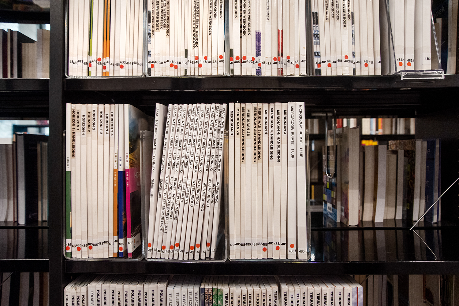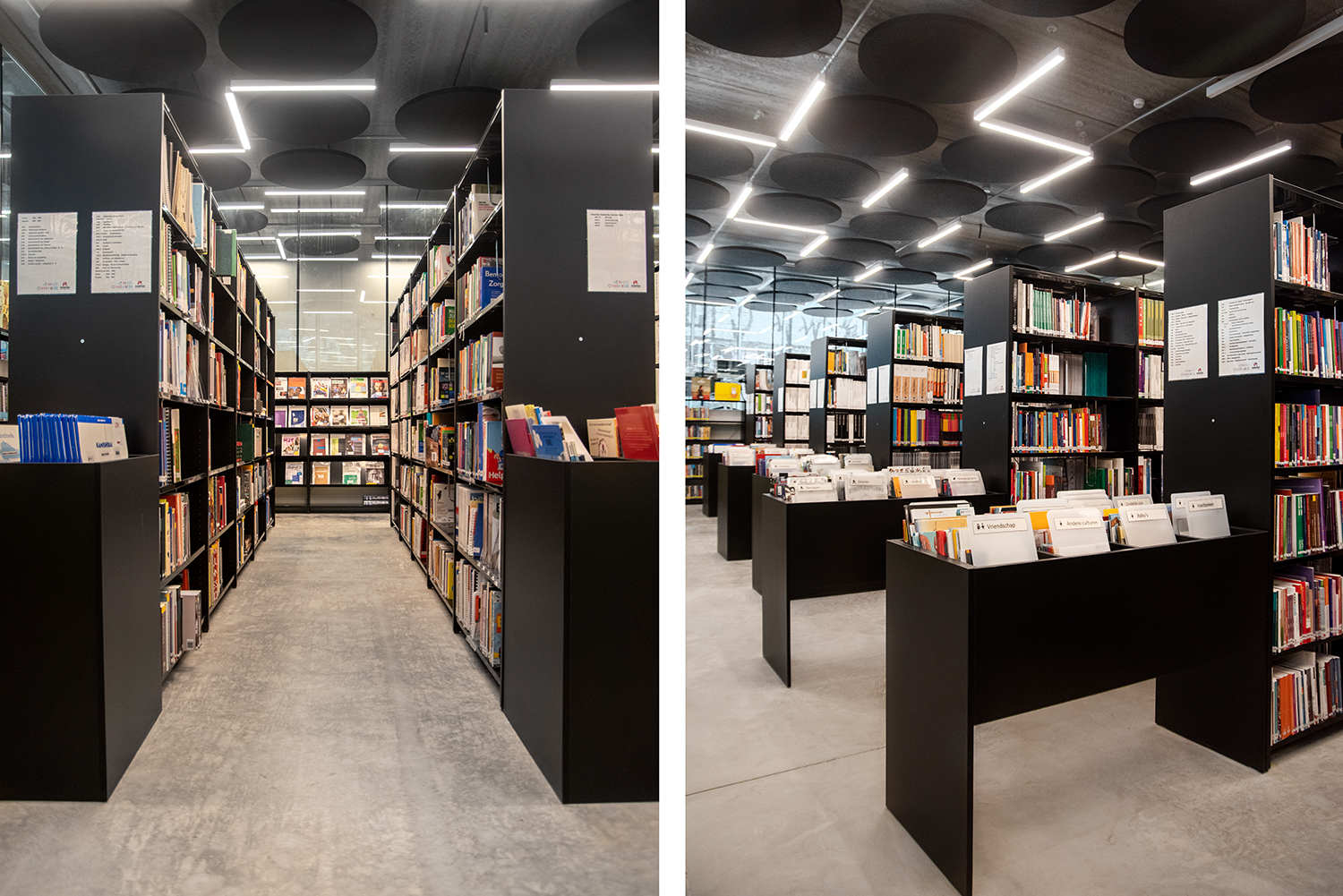 In a trendy and lively neighbourhood in Brussels, close to the canal, the Erasmus Hogeschool established its new campus Kanal. The transparent character is striking: a glass facade around the building involves student life in the neighborhood and vice versa. On the ground floor, the library is one of the eye-catchers in the interior. The black library shelving fits perfectly into the sleek, contemporary architecture of exposed concrete and wood and gives all the attention to the contents.