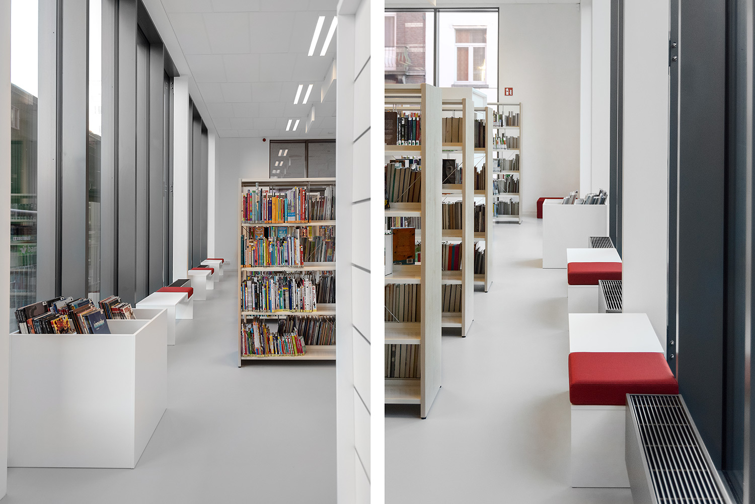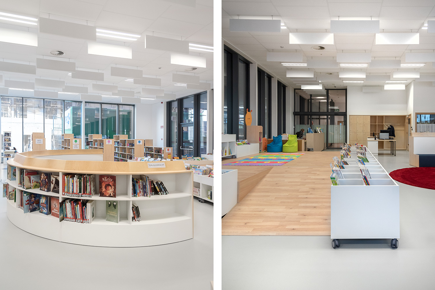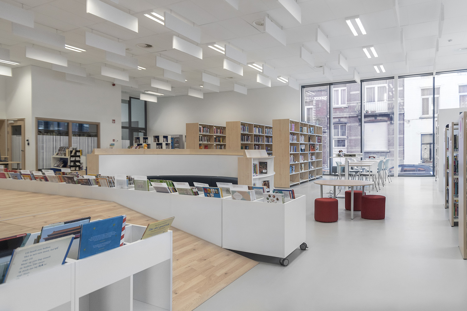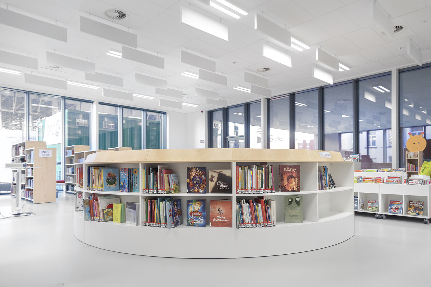 The goal with the new library in Koekelberg was to make it a beautiful and modern library. And so it is. The library is embedded in a larger complex with a sports hall and a multi-purpose hall, making new partnerships possible. The library becomes part of daily life, after school or sports you can easily visit the library. The interior is designed with focus on easy wayfinding, many seating areas and the possibility of privacy. Thoughts on the library journey have been included: where does the user enter the library and how is the user best guided on the onward journey? The user will go through the library in a natural flow; from baby corner to first readers to teenage area and to adult department. Along the way the user passes comics, DVD’s and reading areas.