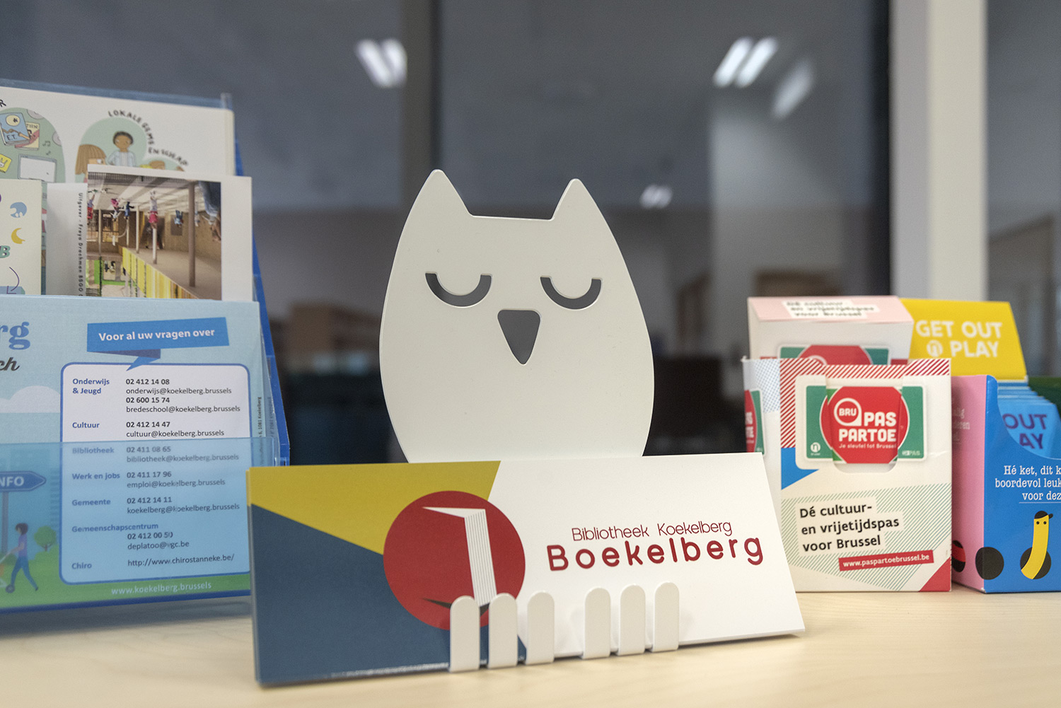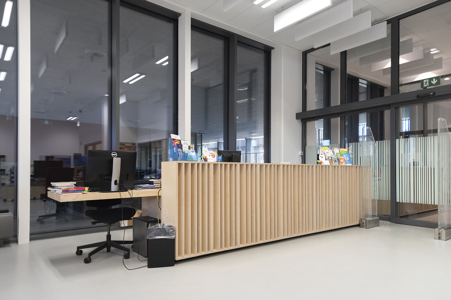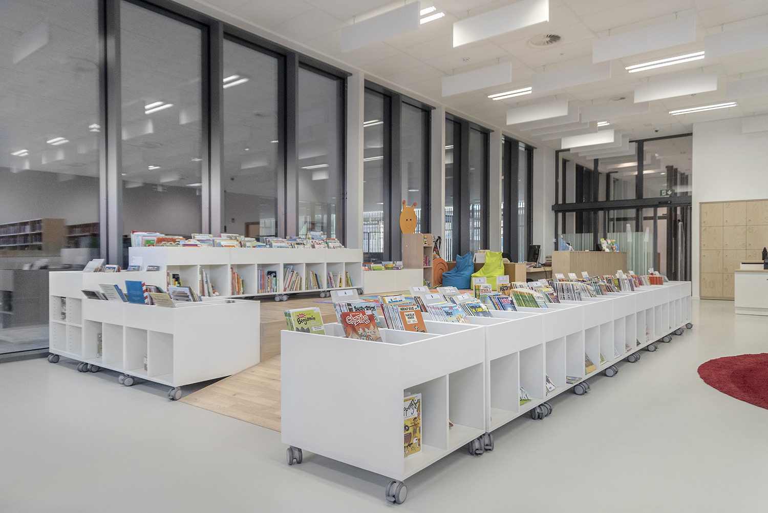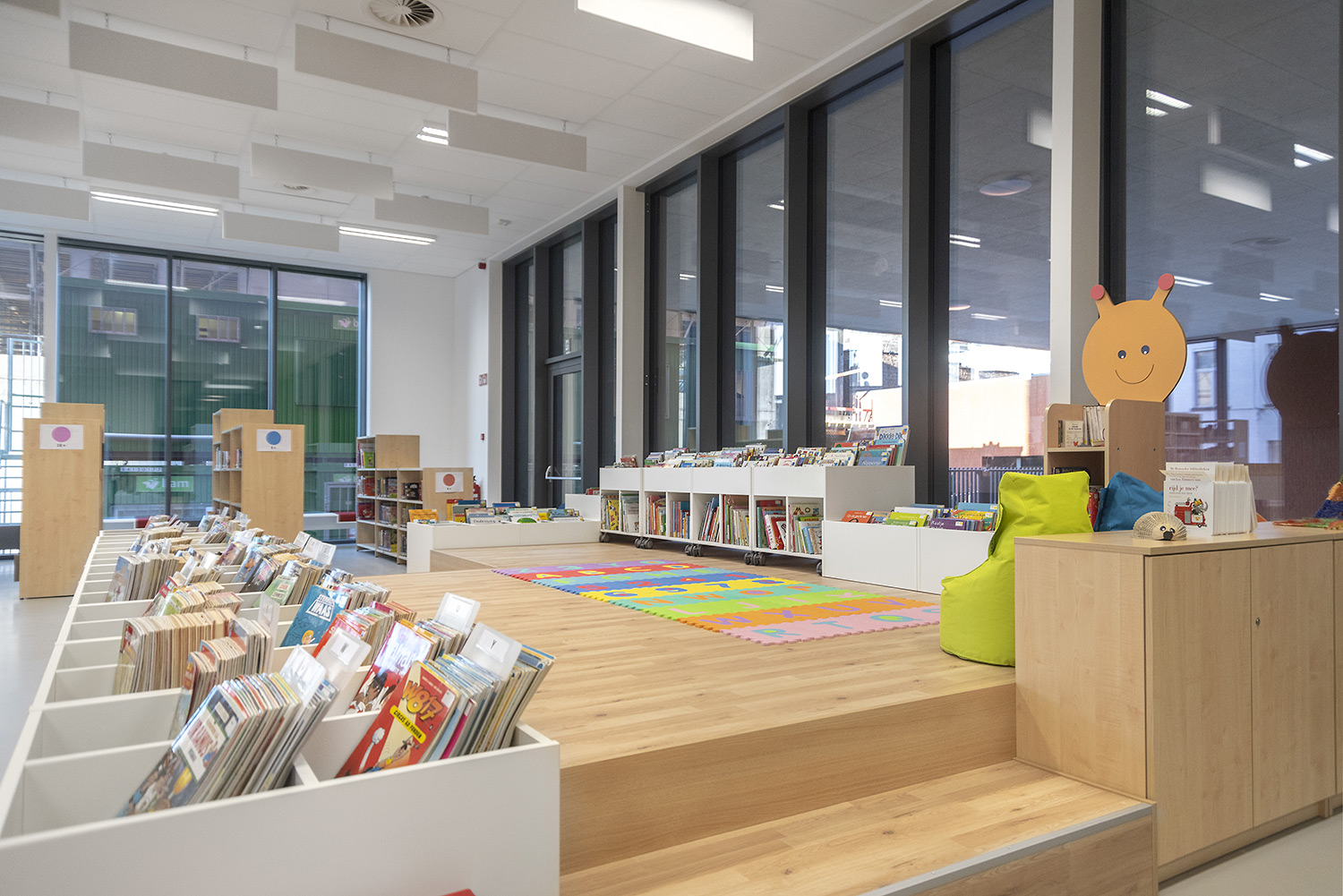 The goal with the new library in Koekelberg was to make it a beautiful and modern library. And so it is. The library is embedded in a larger complex with a sports hall and a multi-purpose hall, making new partnerships possible. The library becomes part of daily life, after school or sports you can easily visit the library. The interior is designed with focus on easy wayfinding, many seating areas and the possibility of privacy. Thoughts on the library journey have been included: where does the user enter the library and how is the user best guided on the onward journey? The user will go through the library in a natural flow; from baby corner to first readers to teenage area and to adult department. Along the way the user passes comics, DVD’s and reading areas.