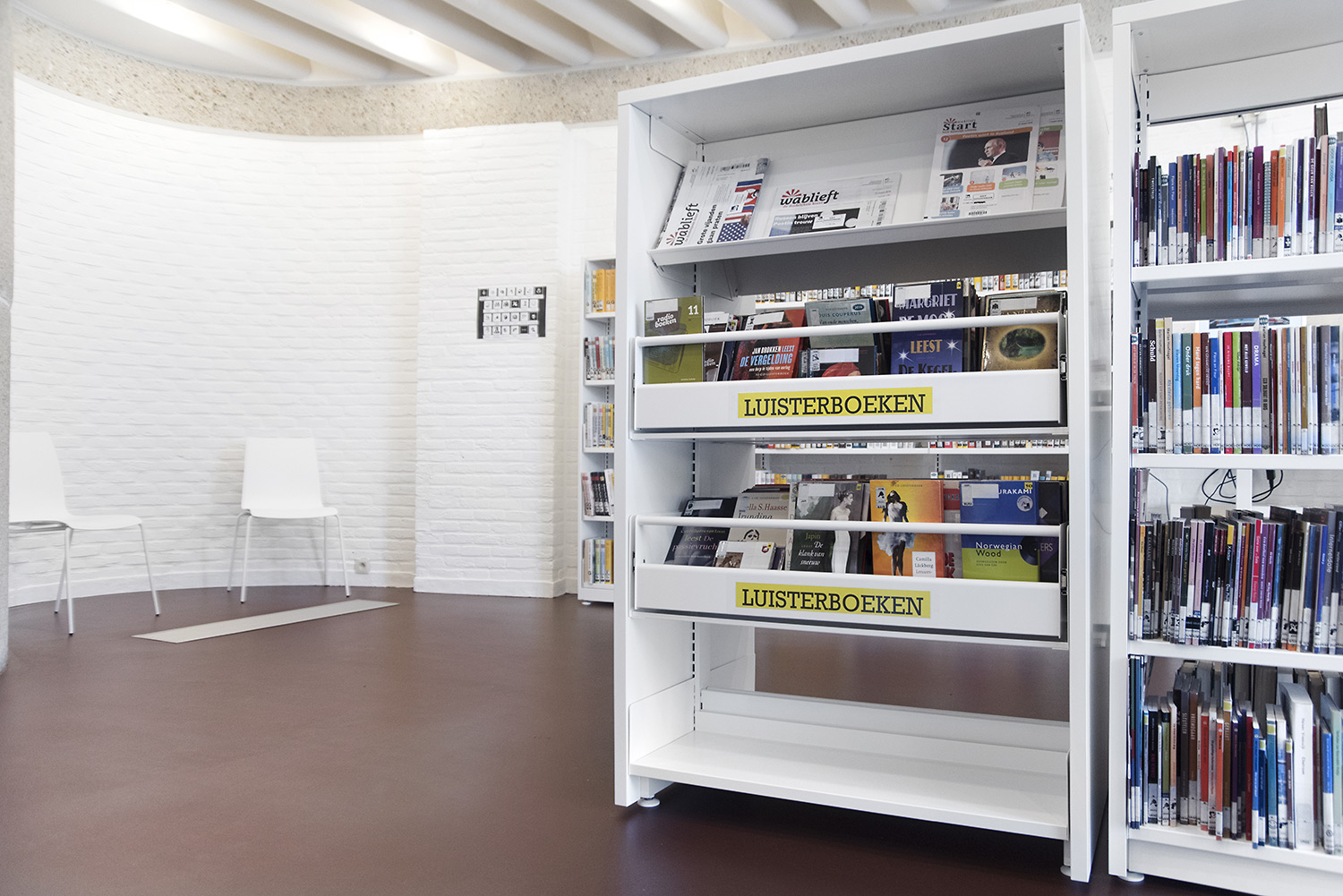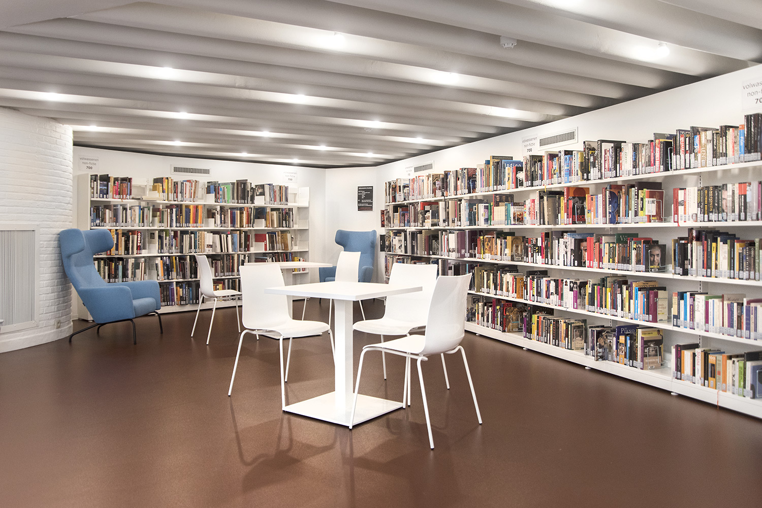 An open spacious design with special attention to book presentation, pleasant seating areas with a coffee corner, self-service desk, WiFi for byod, a bluetooth listening chair and many more elements to be discovered in the library.