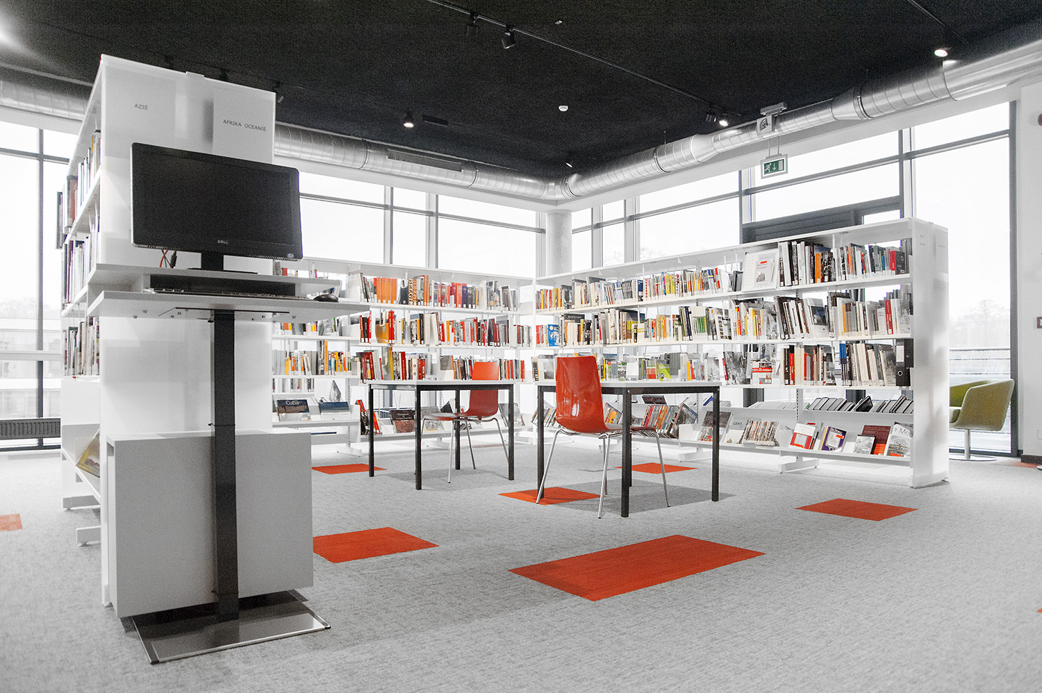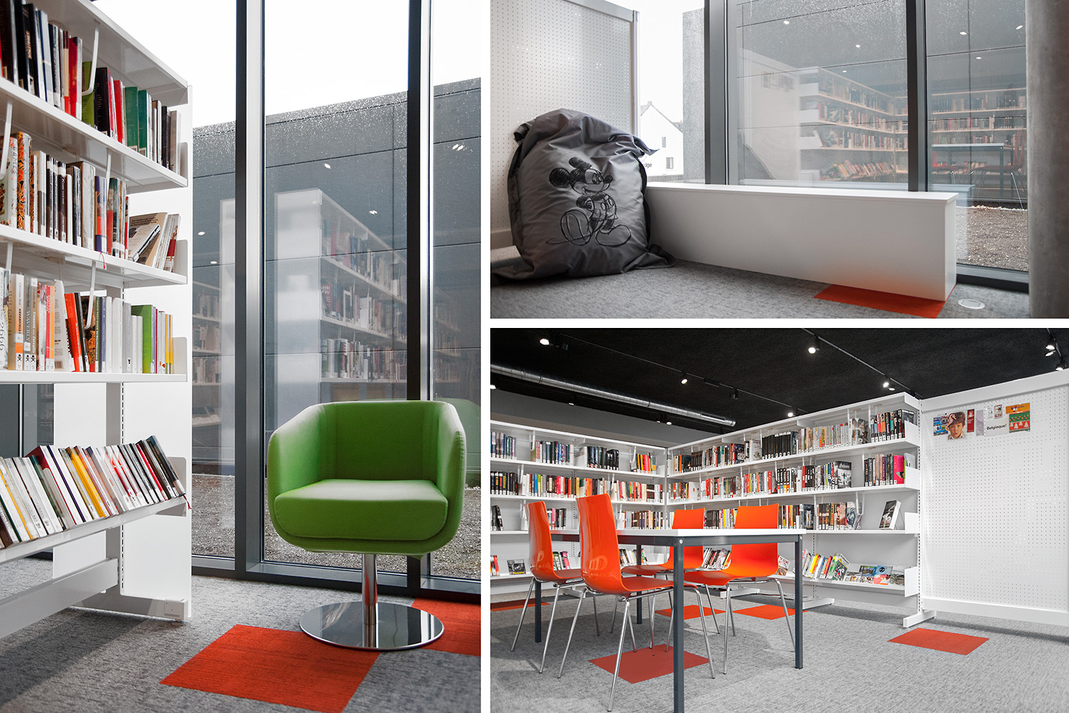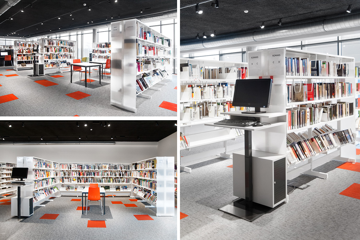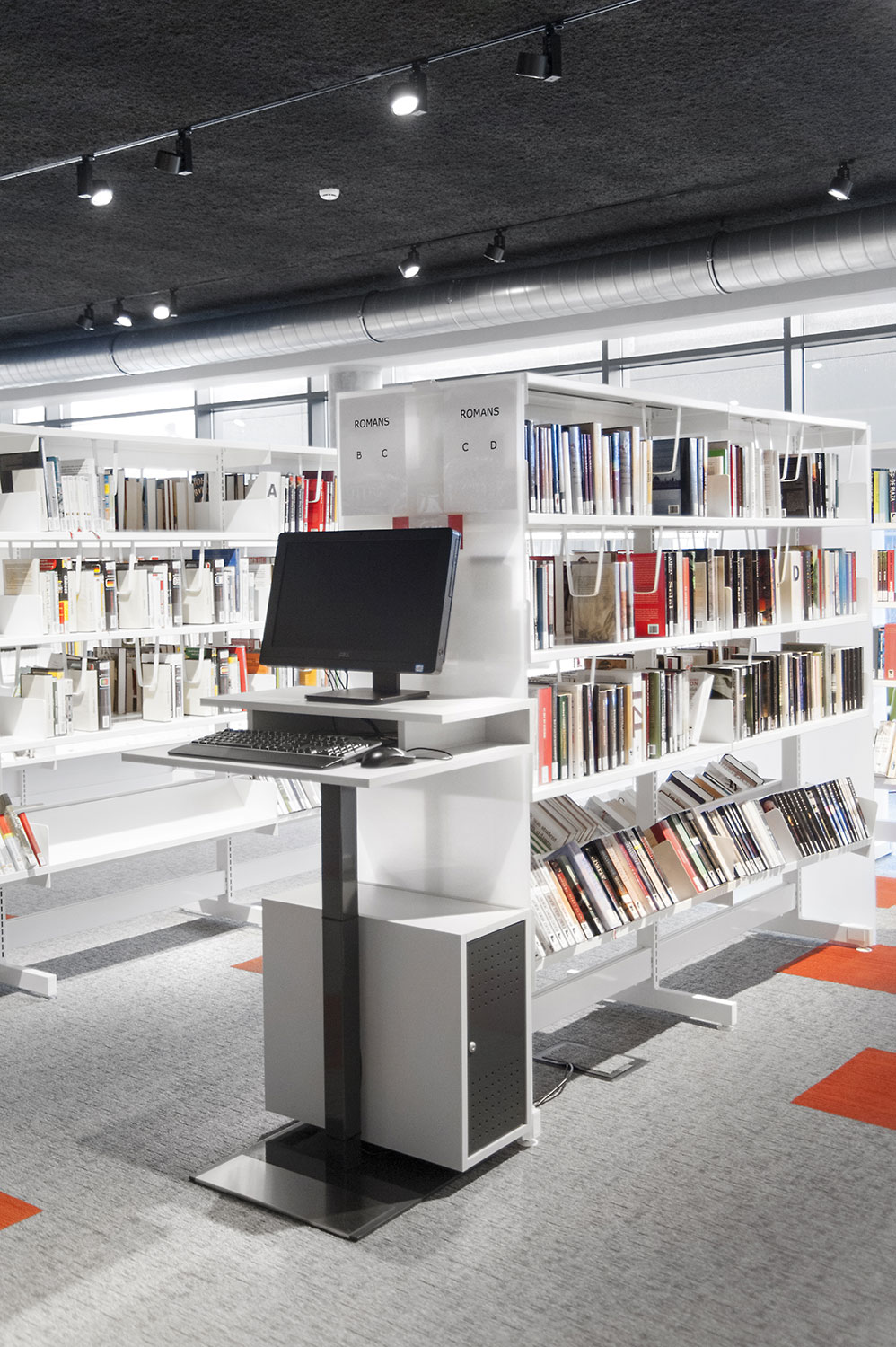 Special attention was given to the ergonomic shelving, the kids’ corner and seats, reading areas and workplaces. The black ceiling forms a contrast to the white furniture, which conveniently models the space thanks to its limited elevation and straight design.