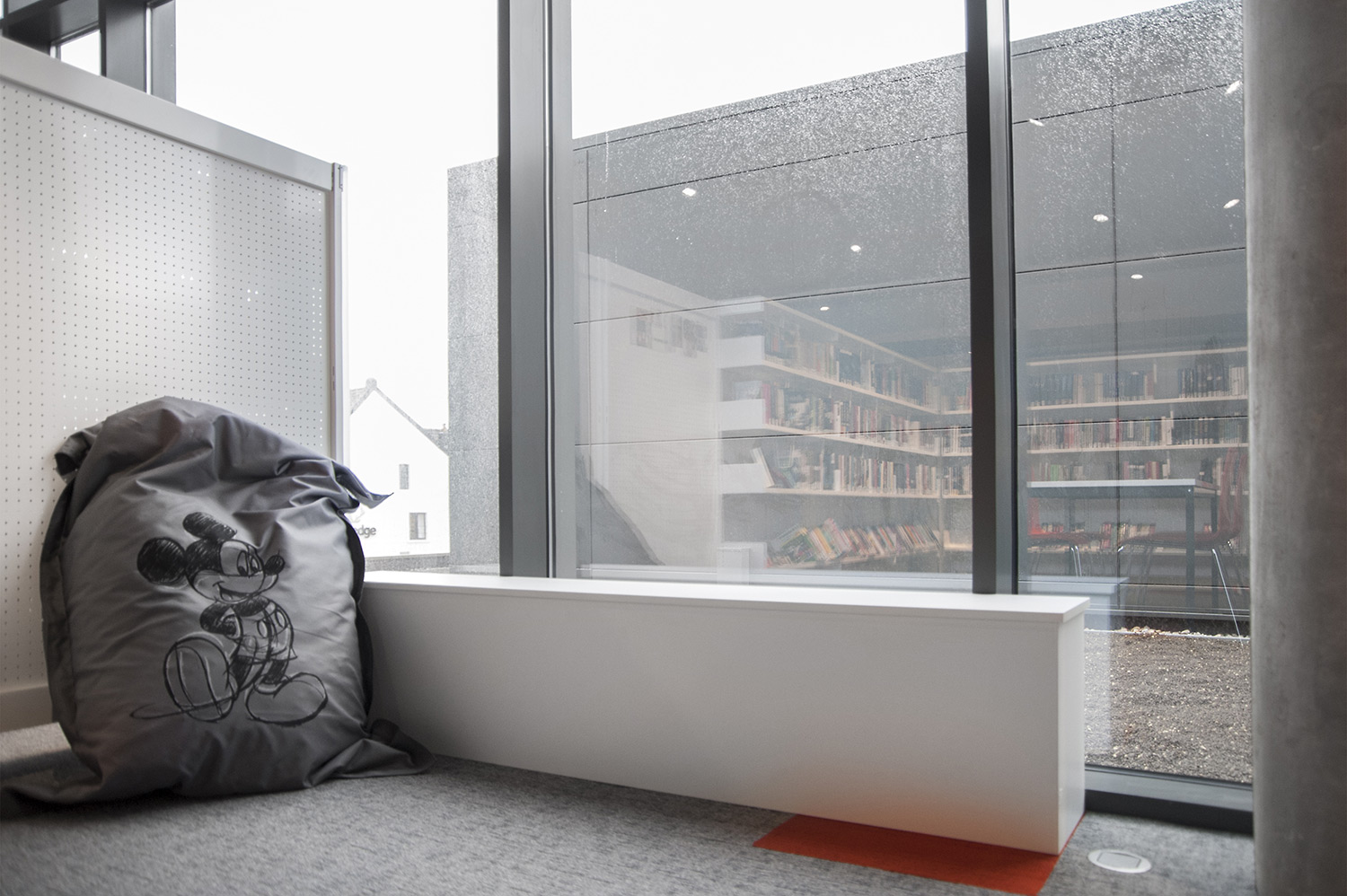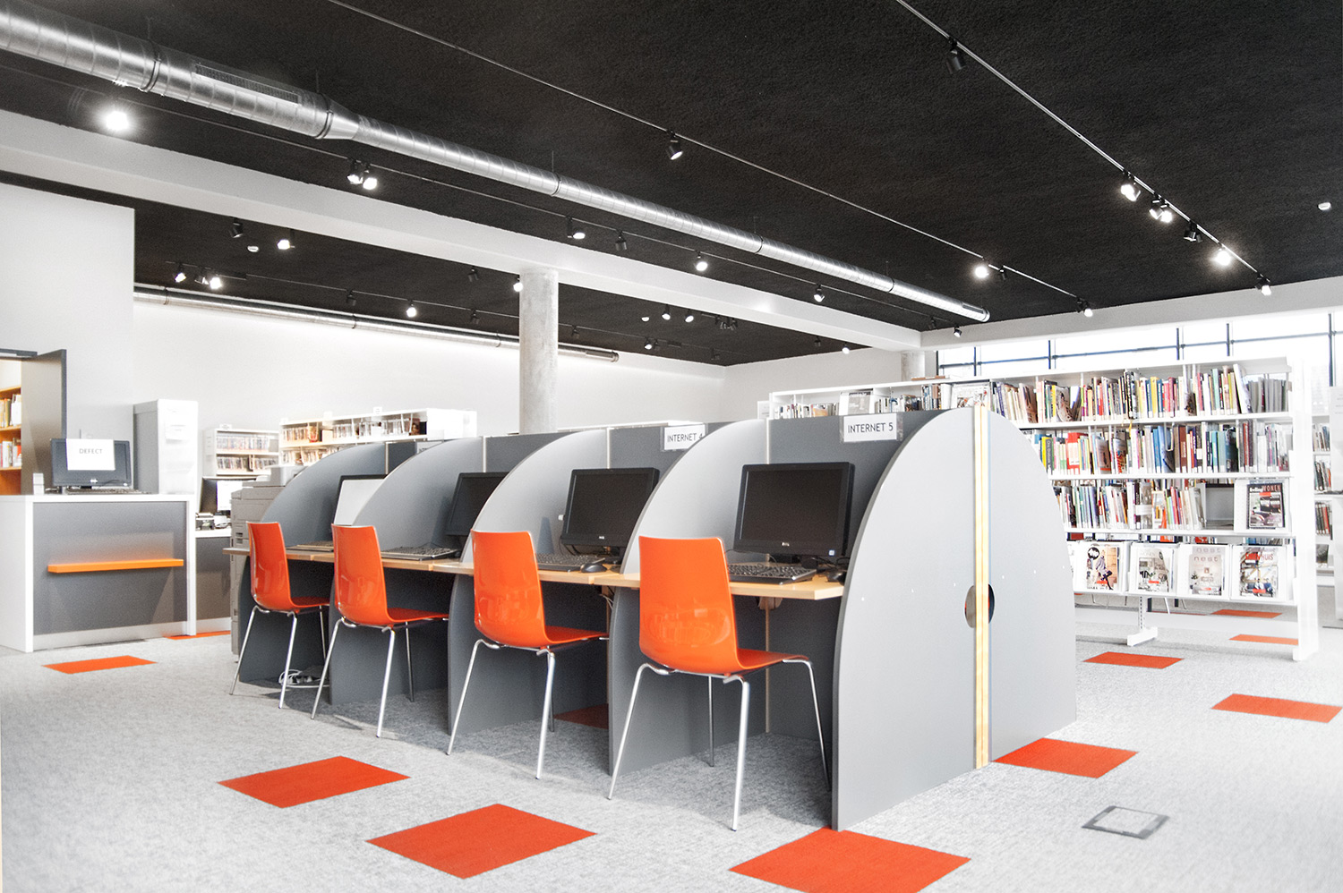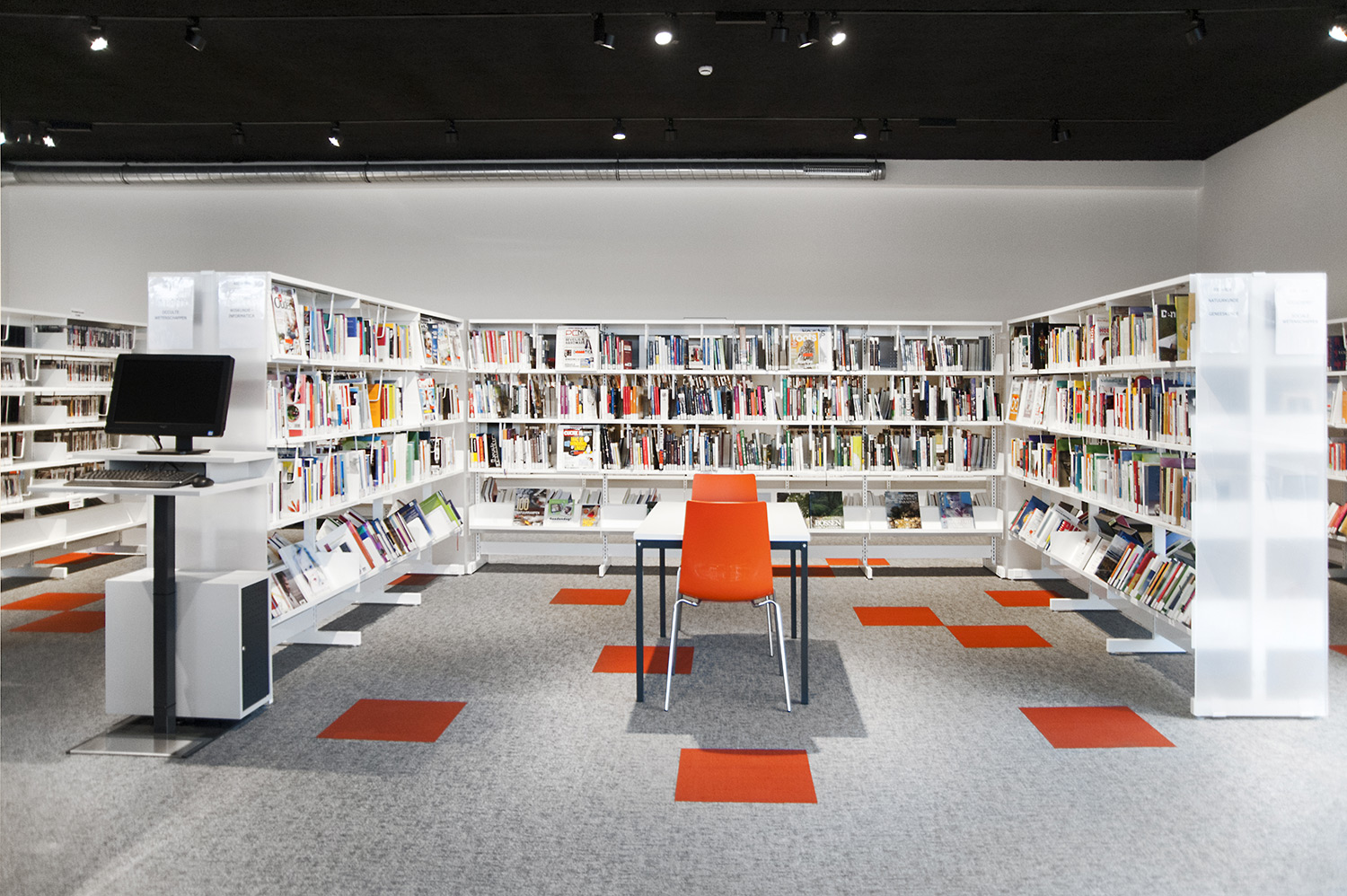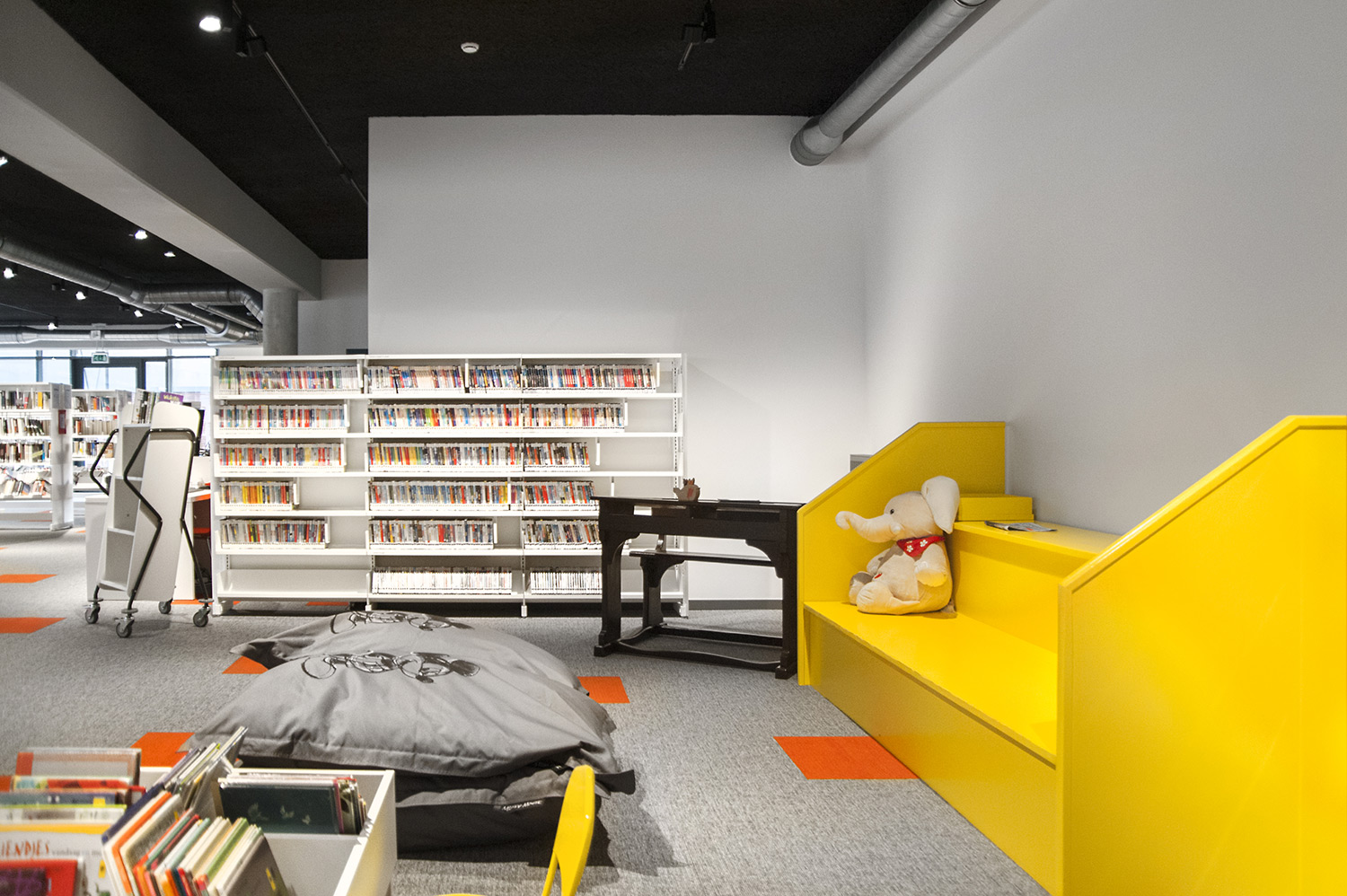 Special attention was given to the ergonomic shelving, the kids’ corner and seats, reading areas and workplaces. The black ceiling forms a contrast to the white furniture, which conveniently models the space thanks to its limited elevation and straight design.