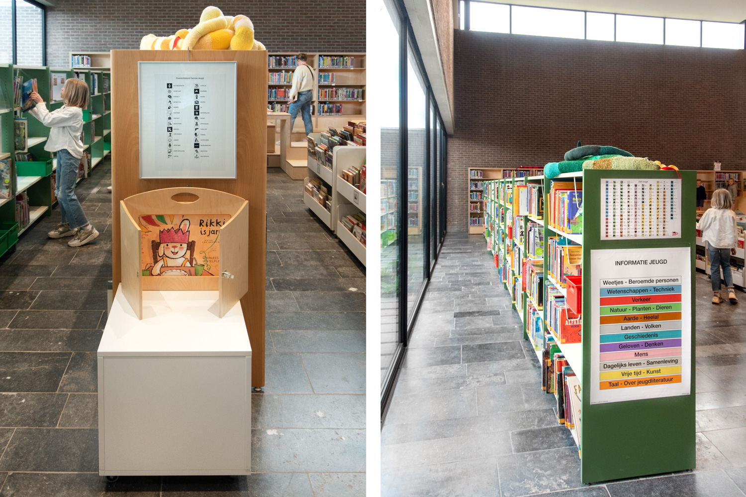 Upon entering the library, the visitor first meets a cozy reading room. In the rest of the library, you will find a mix of library shelving systems and bespoke furniture in a sensible choice of materials, that go well with the original interior.