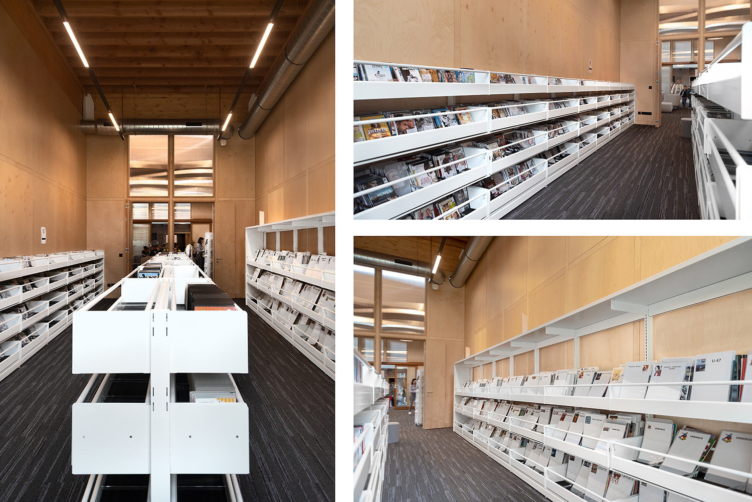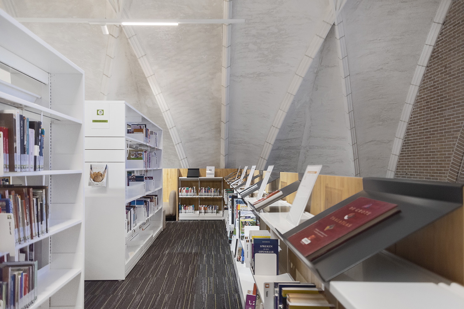 The location of the library is unique: in and next to the Saint-Laurentius church in Wielsbeke. The church remains in use, the library is installed on a new mezzanine in the nave of the church. Adjacent to the church, a new building houses, among other things, the counter, the comics and DVD department and the back office. The architects made an optical connection between existing and new: the red-brown corrugated façade panels evoke the image of the spine of books and match the color of the church.