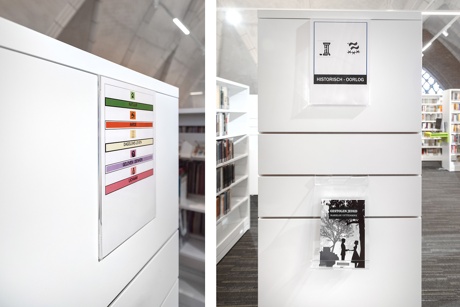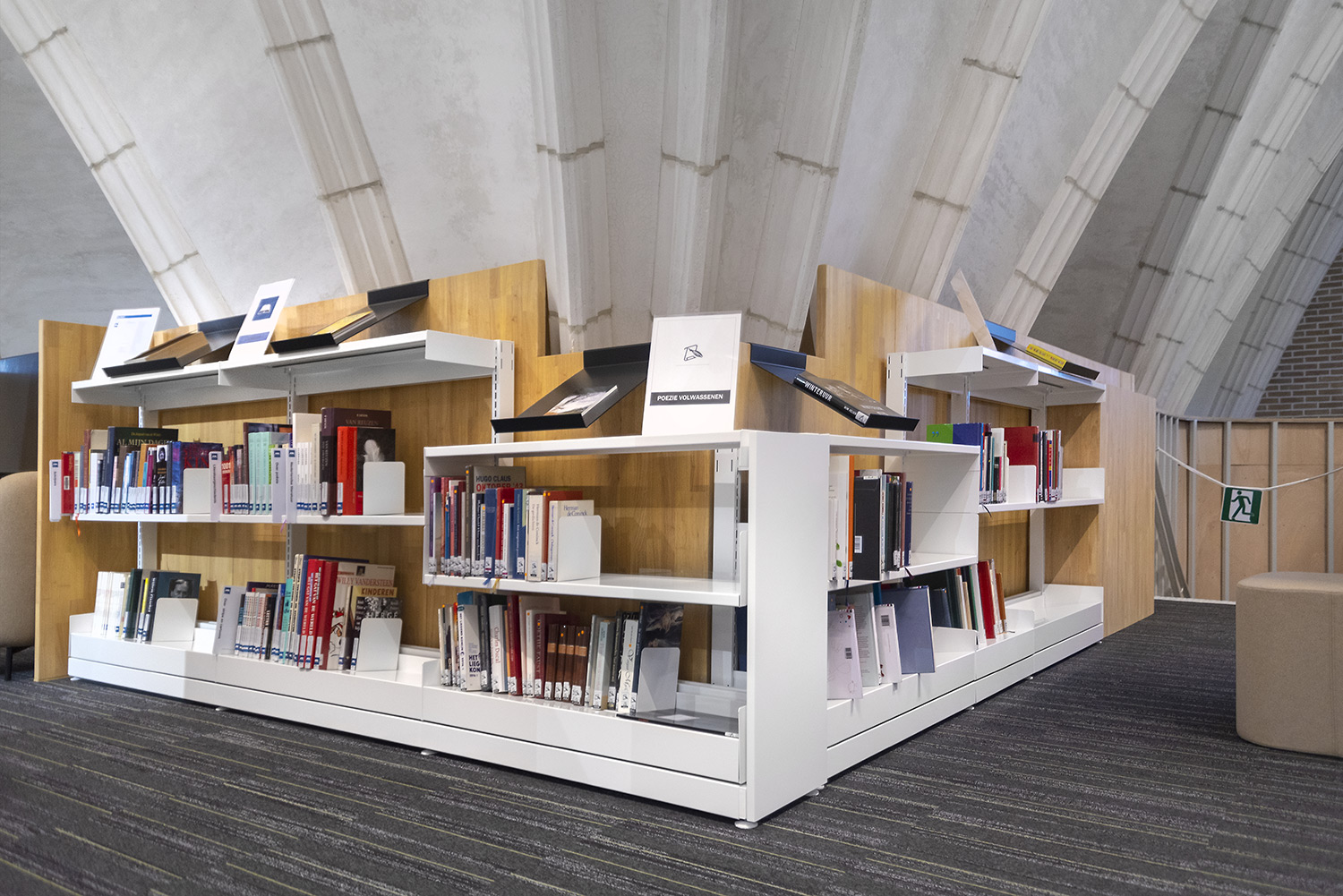 Library shelves and furniture in white and soft colors give full attention to the books, but there is more. Librarian Nele Verfaille: "Our book collection is comfortably displayed and we have several spots throughout the library where people can sit and read or look up, meet, and where we can organize activities."