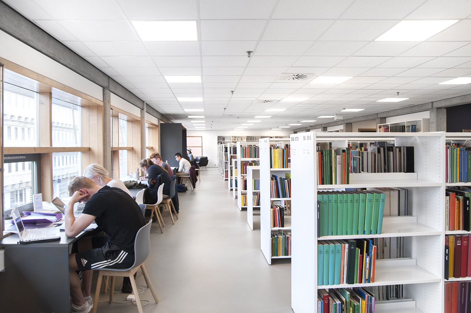 A new grand staircase with seating leads to the first floor where a new study zone is the setting for a studio environment and classrooms with several study places. The study zone now appears much more open and the space is utilized more than before.