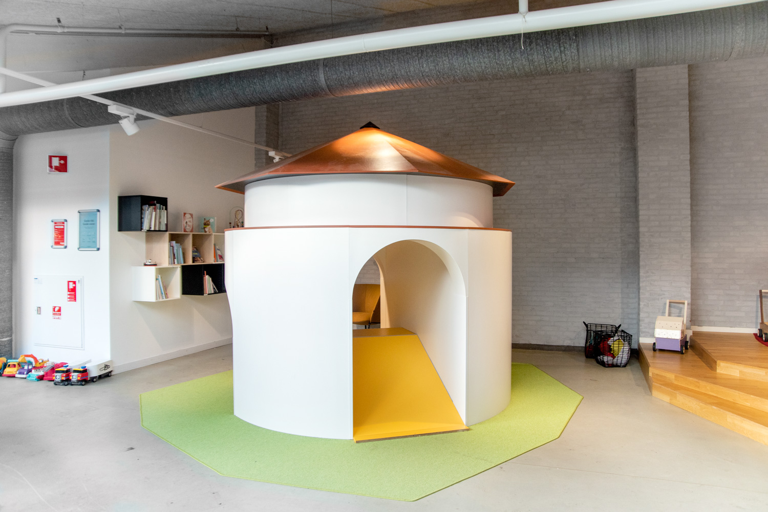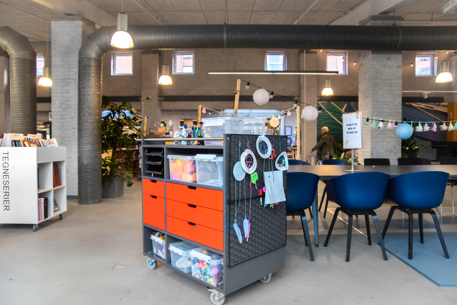For the smaller children, the focus was to introduce a play area that also welcomed the parents. There is a tower called “Krudttårnet”, a miniature of the town trademark, which is a joy for children to climb and slide on. The turquoise reading caves have been provided with portholes that make it seem like you are under water. The parents or grandparents can take a seat at various lounge seating and enjoy the children playing. Furthermore, the library has new lunch tables and a wardrobe.