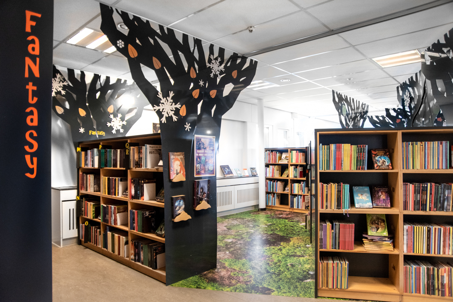 Fantasy, recycling, staging, and dissemination have been key factors for the interior at Guldborgsund Public Library. The purpose has been to expand the children’s department with extra space and create a “wow effect” when entering the room. This has been done by incorporating nature elements into the library as well as offering the younger users “touch and feel” experiences. The new interior entices the children and teenagers to discover the forest or look for fish in the water, as the specially designed furniture and foil recreate the essence of the local community in this exciting and adventurous library.