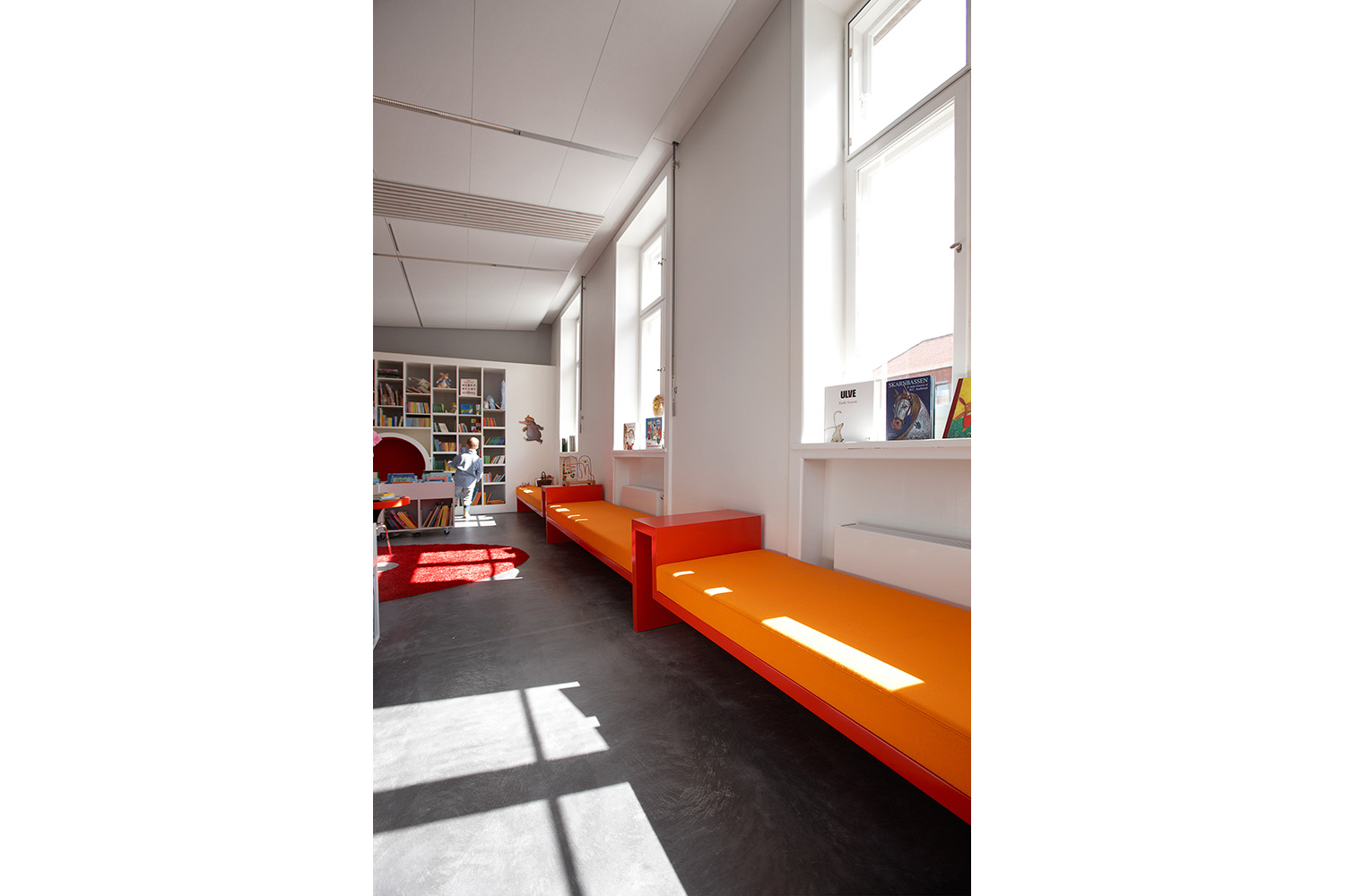 The architecture meets the demands of a modern library where access to e-books is as important as the traditional books. Mobility, flexibility and interaction has been the leading motivation for the project. The result is an inspiring library that brings new life to the town hall.