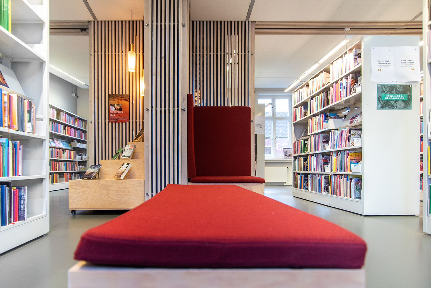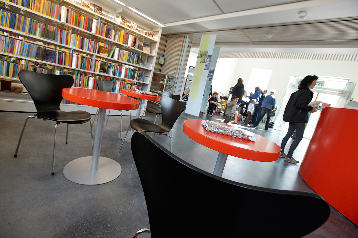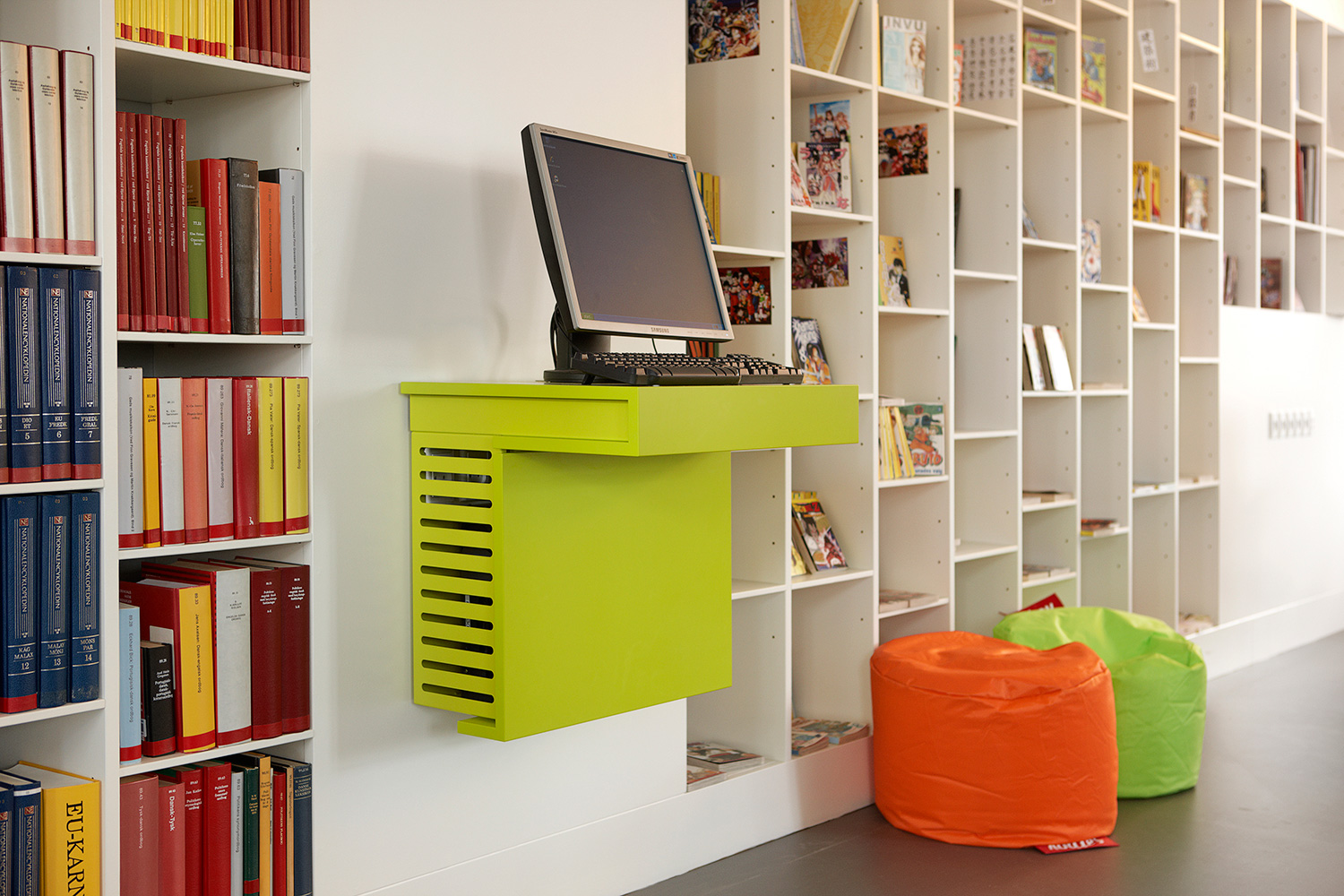The functional Classic Steel Shelving System is combined with special made counters and information desks from PO Inventar. Details like the rya rugs, soft chairs and big foam letters are also worth a notice.