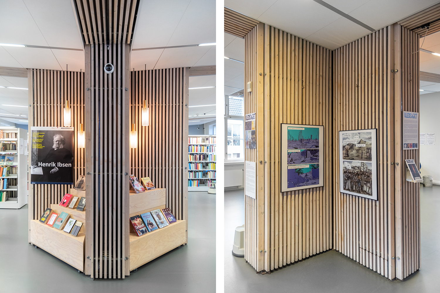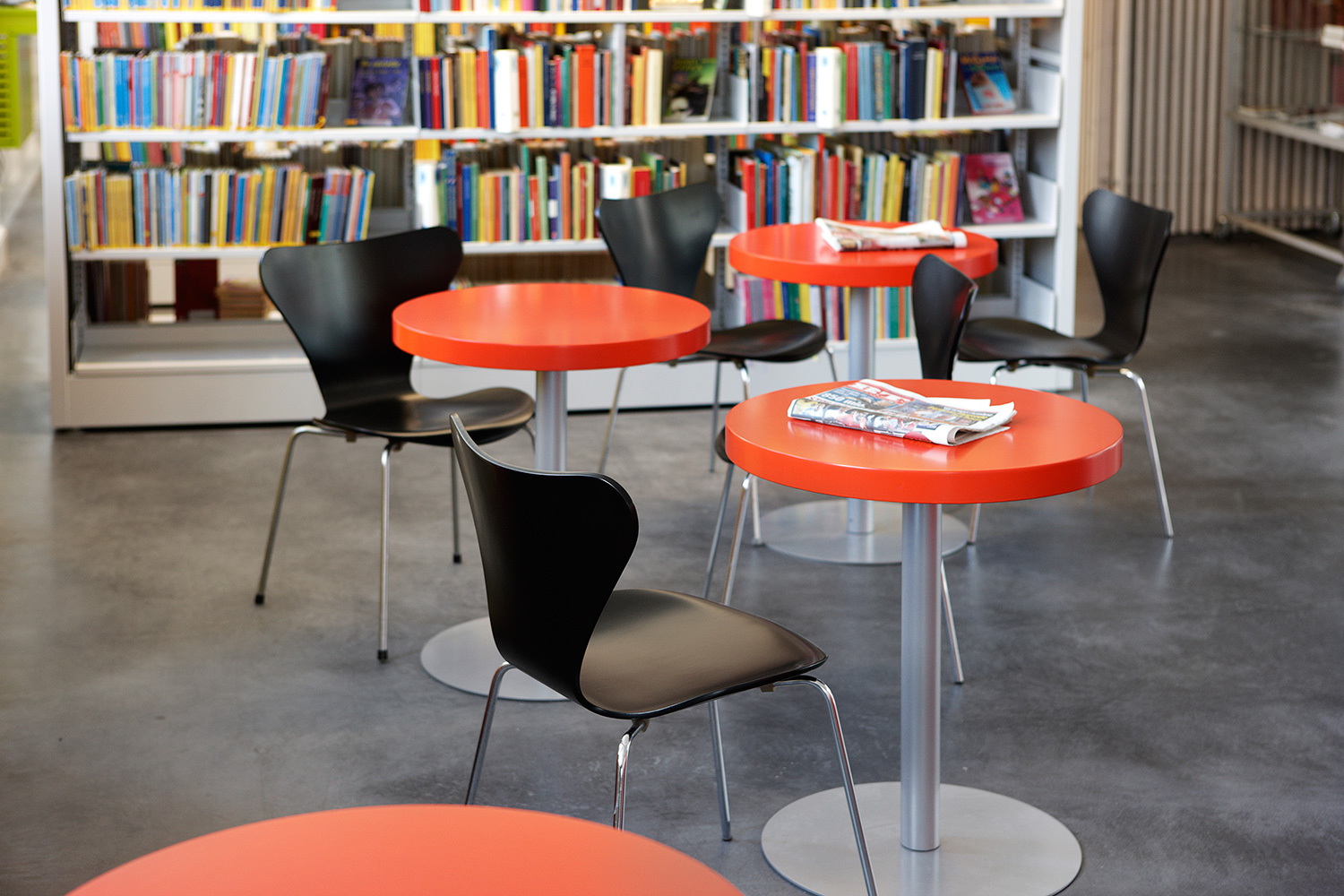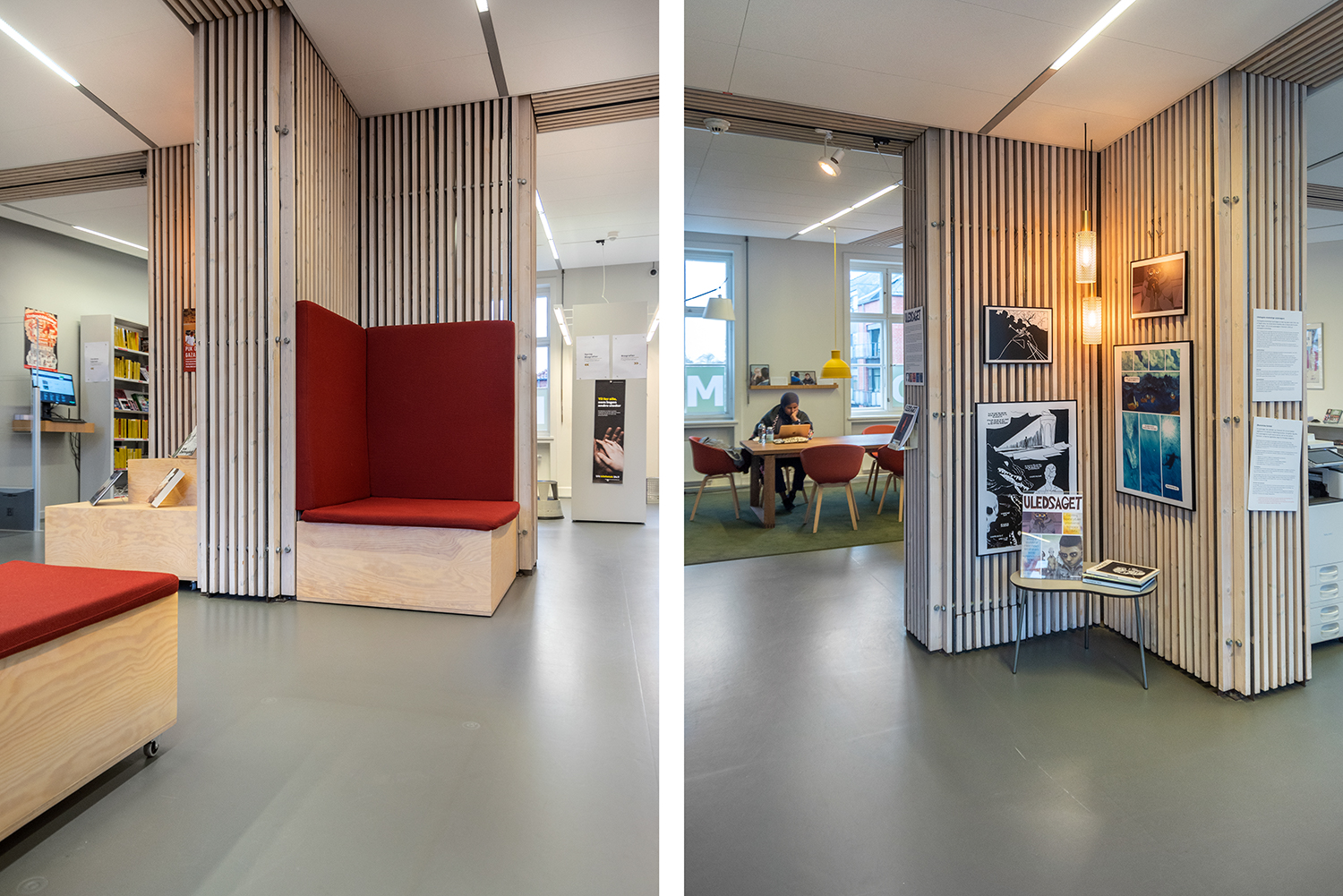 The functional Classic Steel Shelving System is combined with special made counters and information desks from PO Inventar. Details like the rya rugs, soft chairs and big foam letters are also worth a notice.