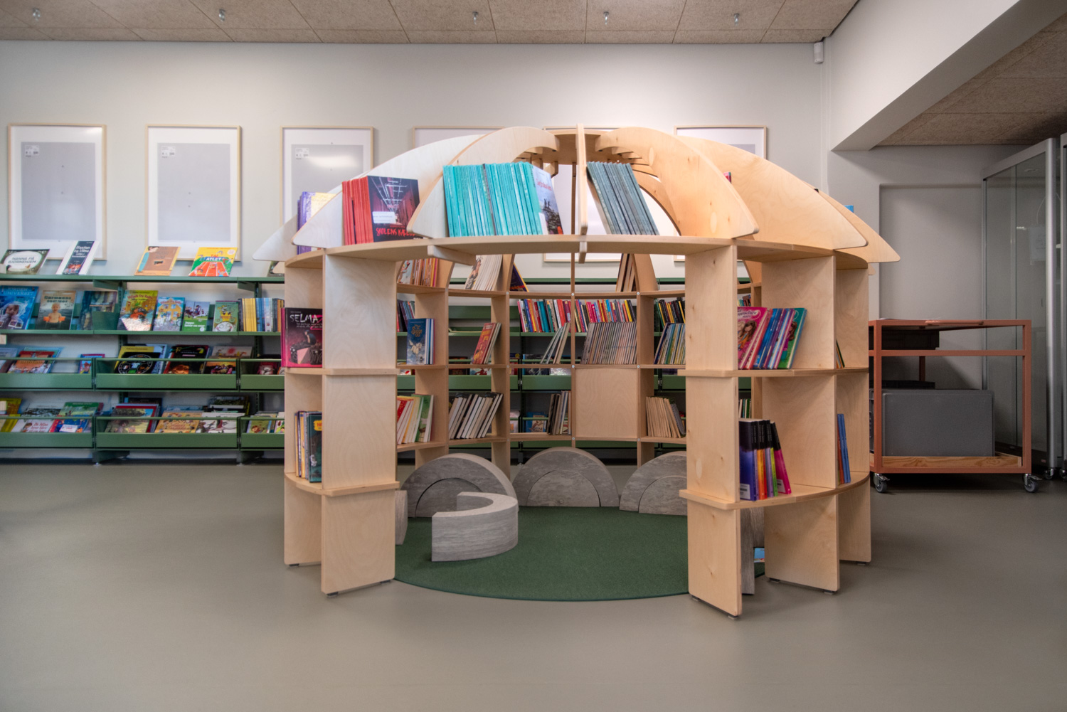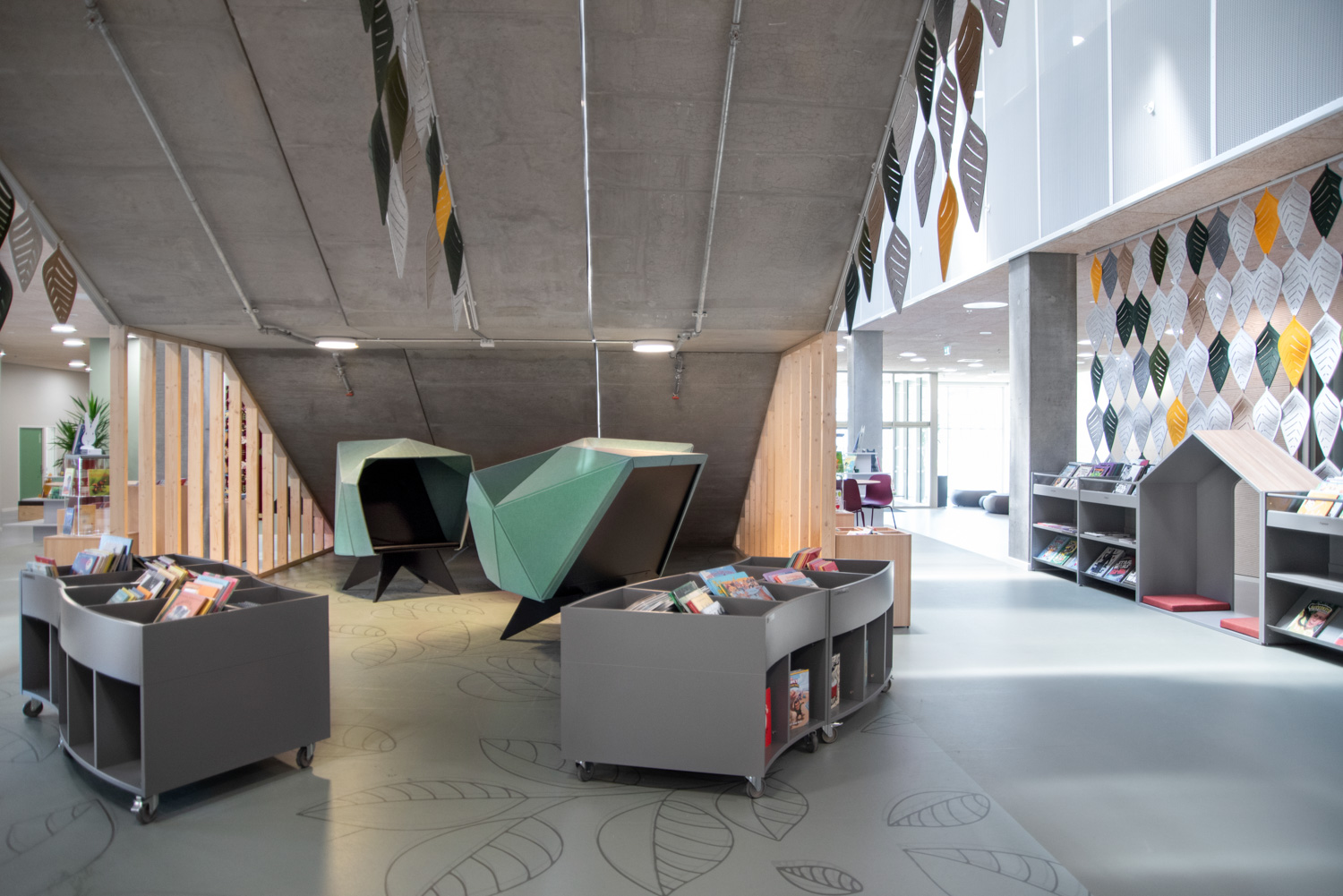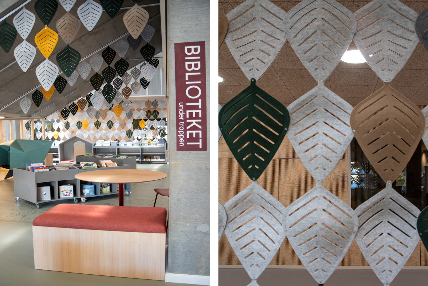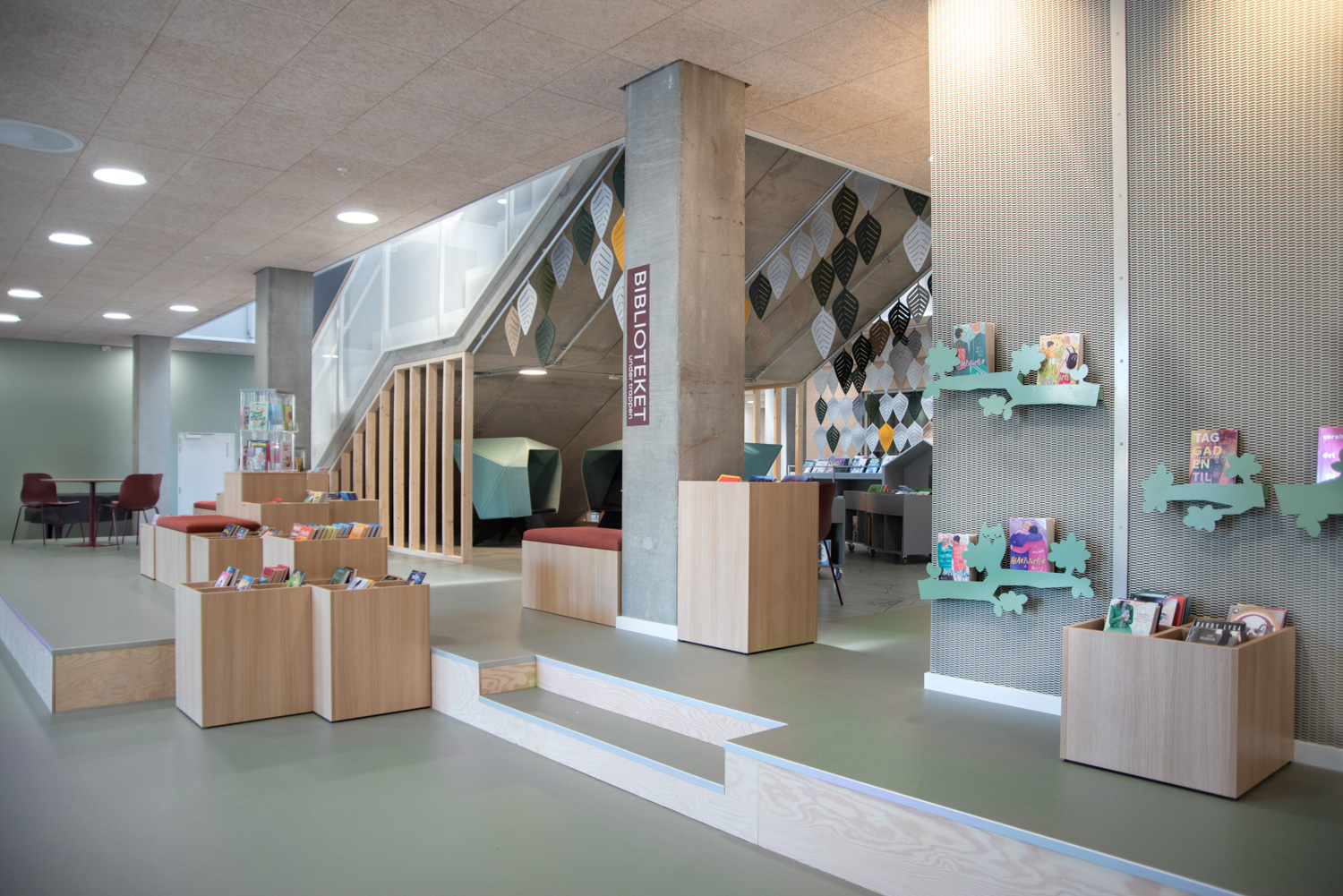 The library stands out with its decorative elements that creates a playful and biophilic expression. At the same time, the library blends in perfectly with the rest of the building as the colours have been chosen to support the warm colour palette of red and blue green colours that is prominent for the entire culture house.