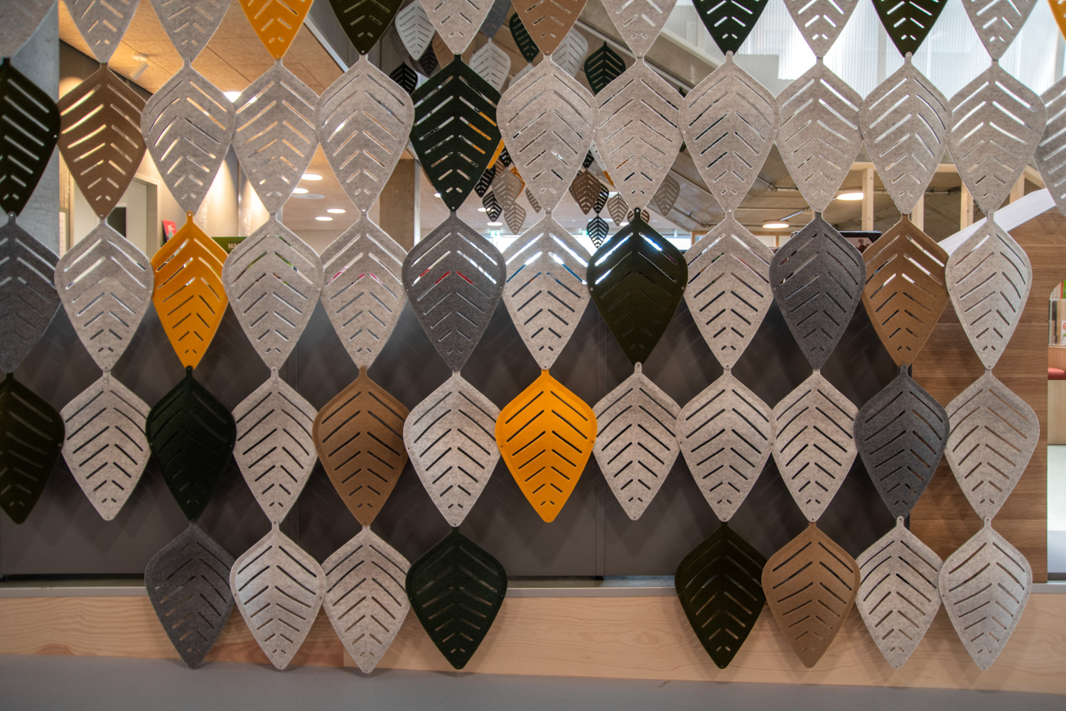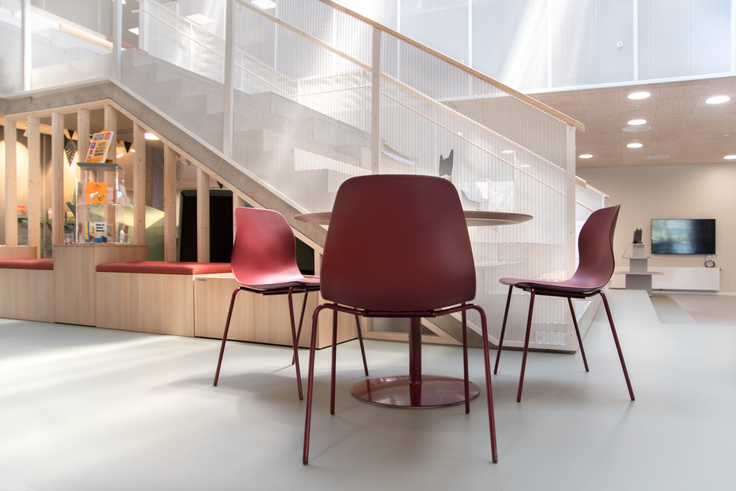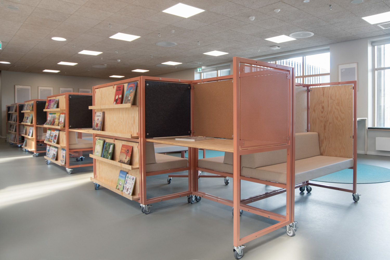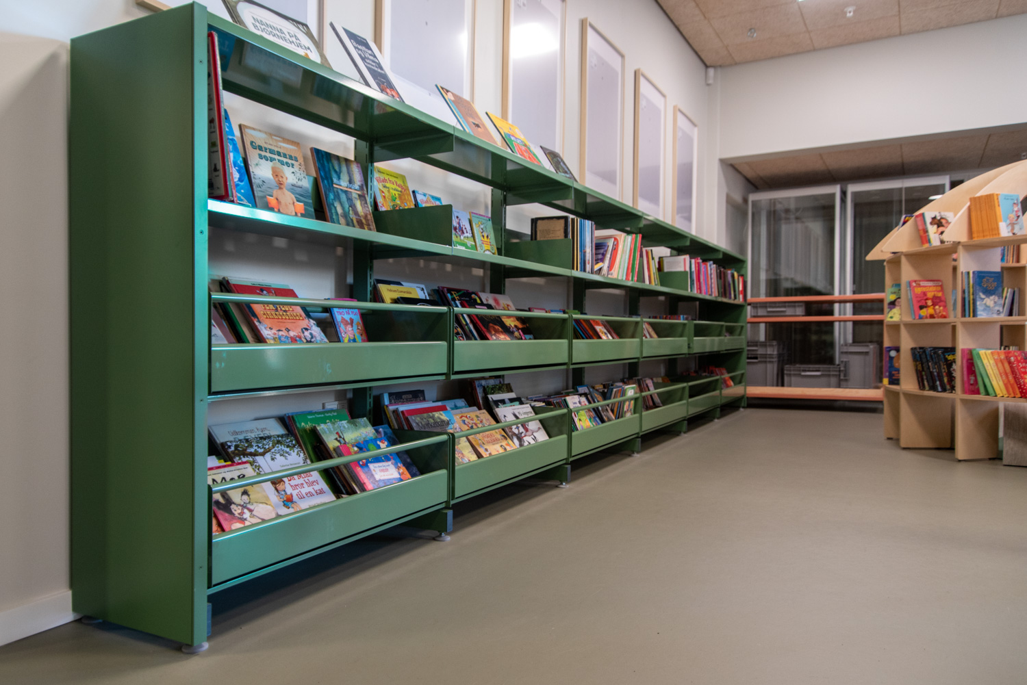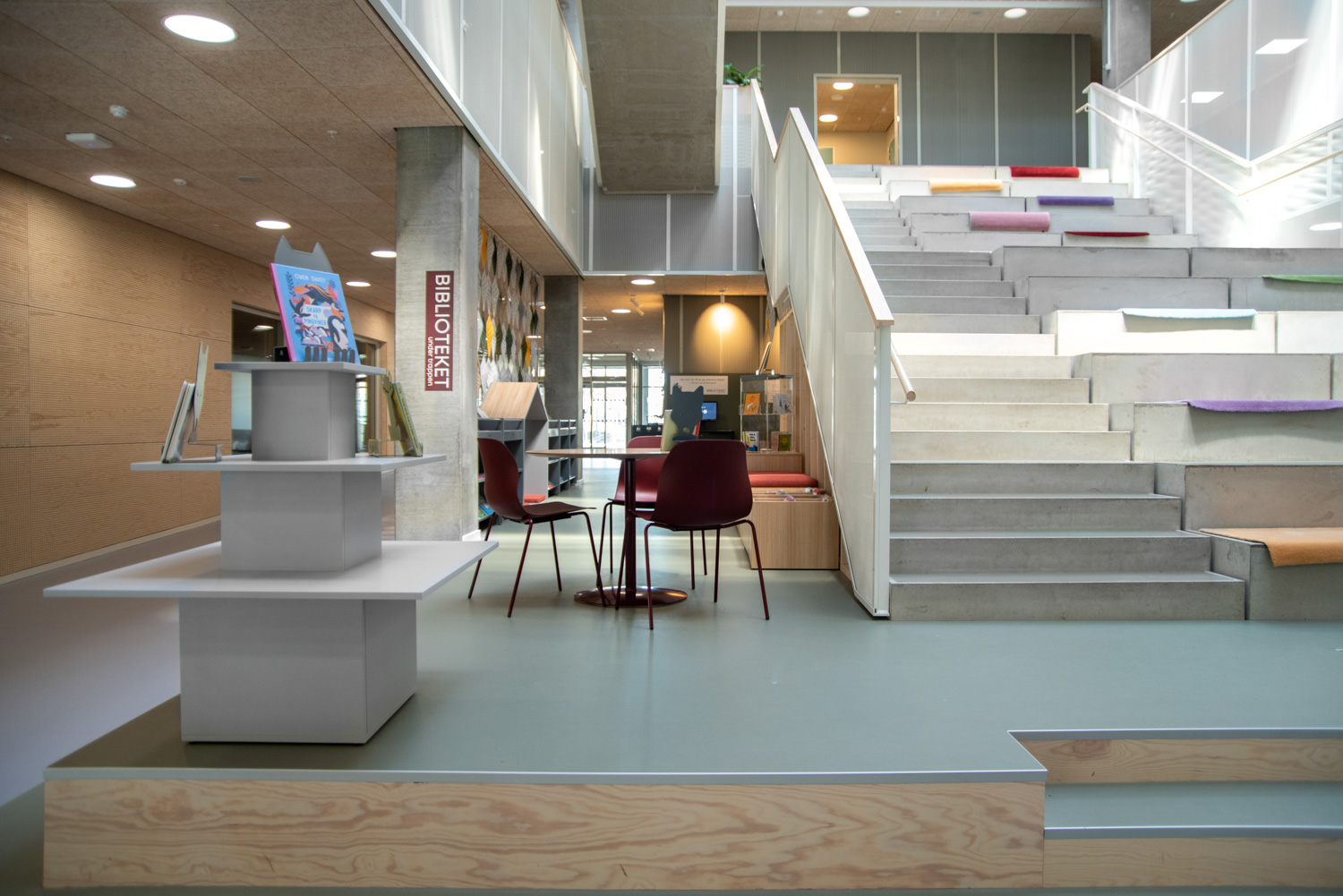 The library stands out with its decorative elements that creates a playful and biophilic expression. At the same time, the library blends in perfectly with the rest of the building as the colours have been chosen to support the warm colour palette of red and blue green colours that is prominent for the entire culture house.