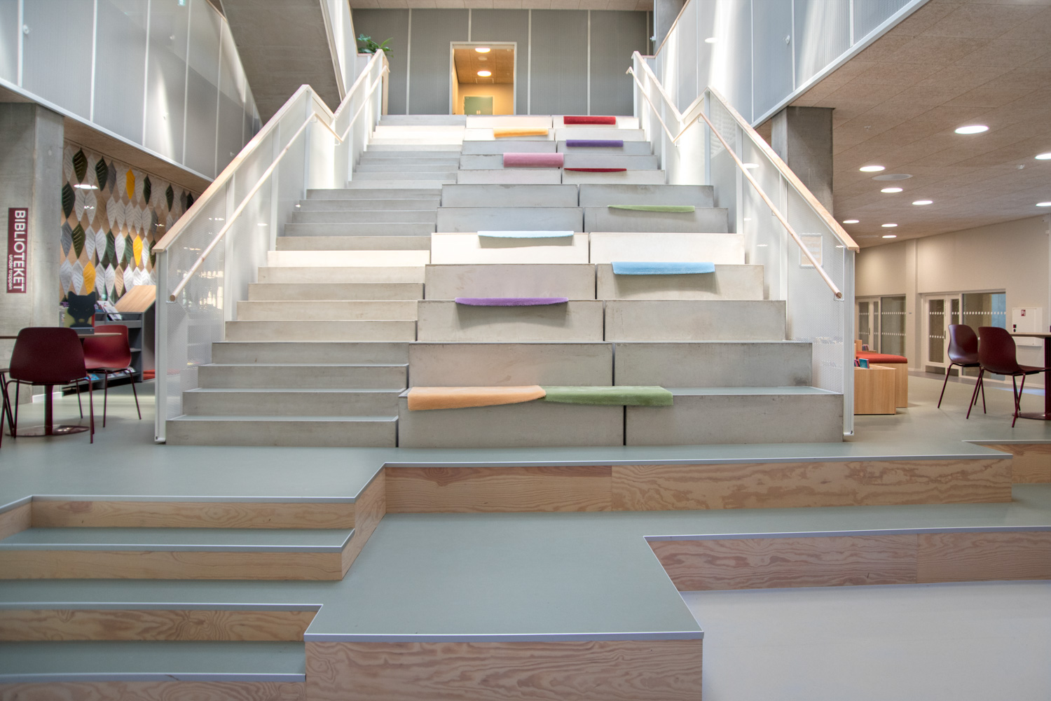 Thus, ”the library under the stairs” works as a waiting area for users of the sports centre. Displays with built-in seating open towards the culture hall and encourage the visitors to spend time among the books. It is up to you to decide, if you want to use the activities of the building or immerse yourself in one of the reading caves.