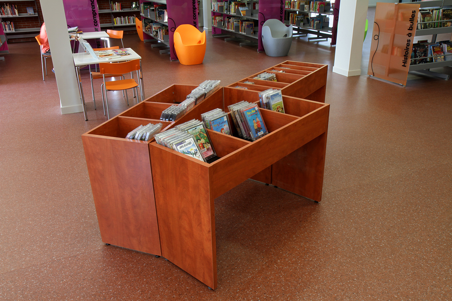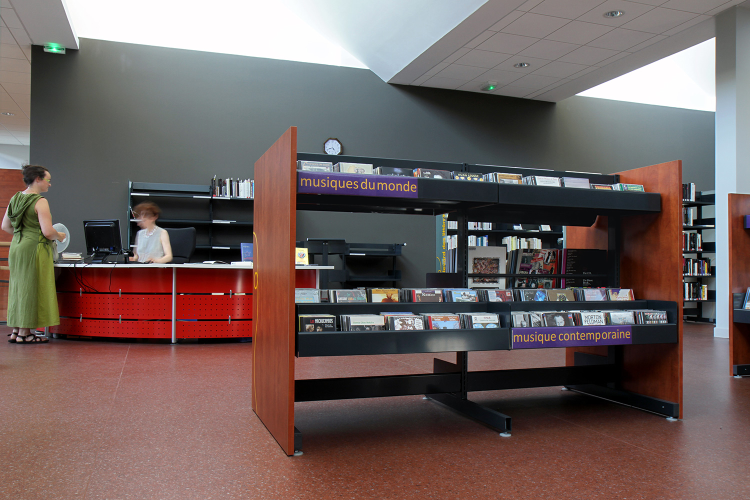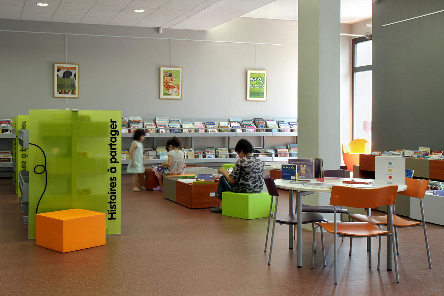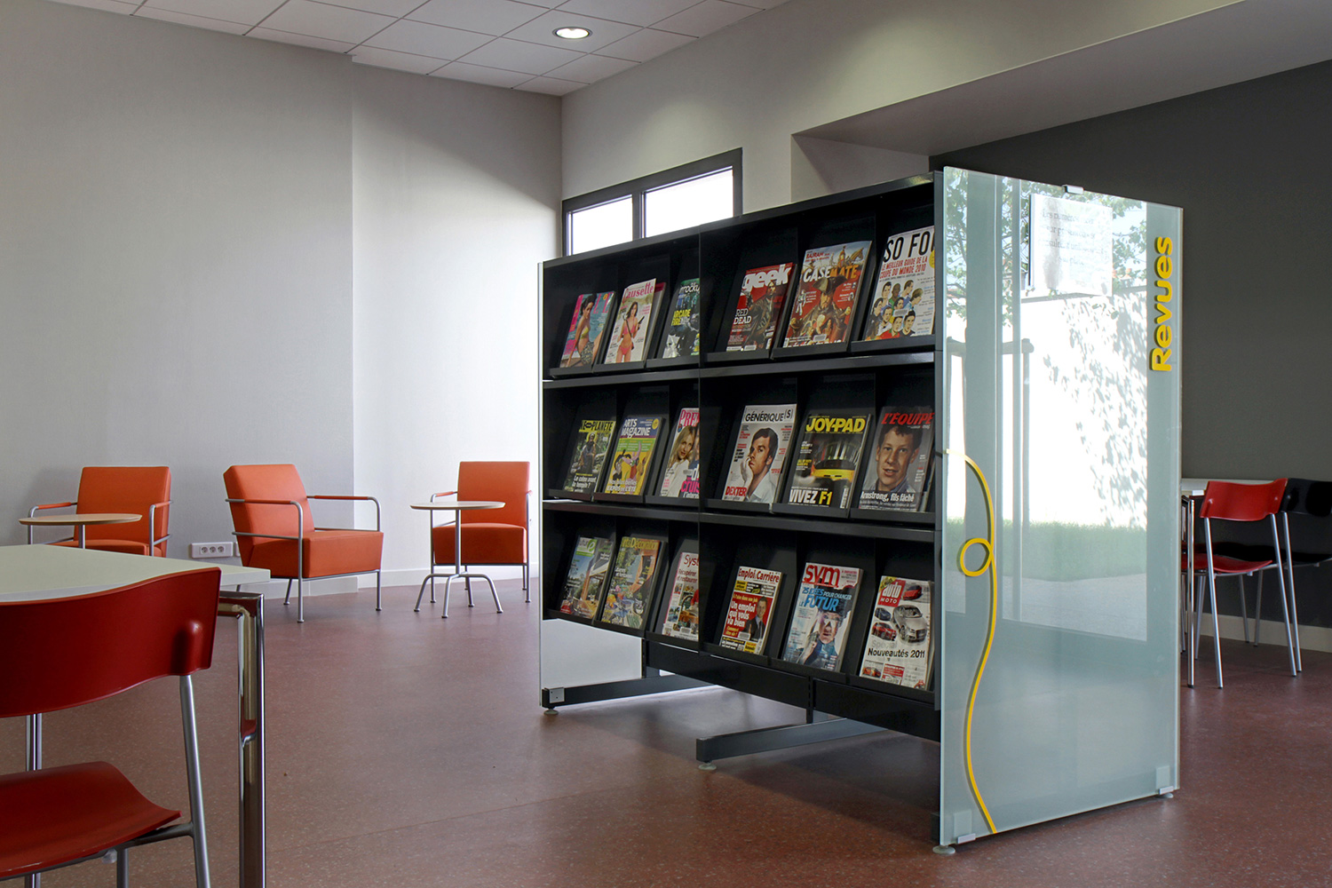 With its dedicated areas for multimedia and the toy library, La Filoche media library has a two-level structure. The interior design combines wood with industrial materials. The play areas for children are bright and awash with colour, and the rest of the library is transparent, light and airy. The Classic Steel Shelving System has been enhanced with multi-coloured acrylic end panels.