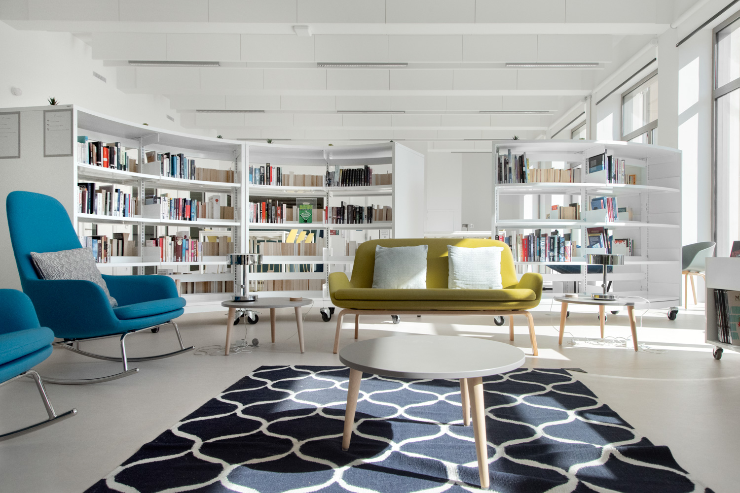 The library is very popular and frequented by its users, the eclectic furniture contributes to this, e.g., with tables of different sizes and heights; alcoves; hammocks; rocking chairs; armchairs and sofas. The shelving systems are also different depending on the type of media to be stored; classic for social science; low and rounded for novels; with browsers for graphic novels; with doors for magazines stored in the Ordrup display unit.