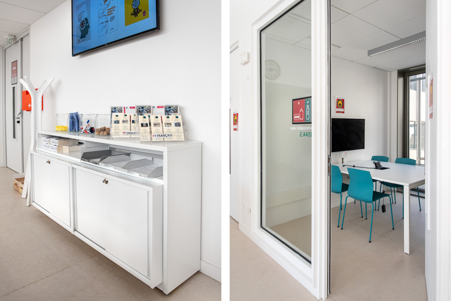 The CRDN is particularly bright and spacious, and the choice was made to equip it with white furniture in order to intensify this effect. Splashes of blue and yellow create a contrast to the white furniture and surroundings and thereby create a warm and cosy atmosphere.