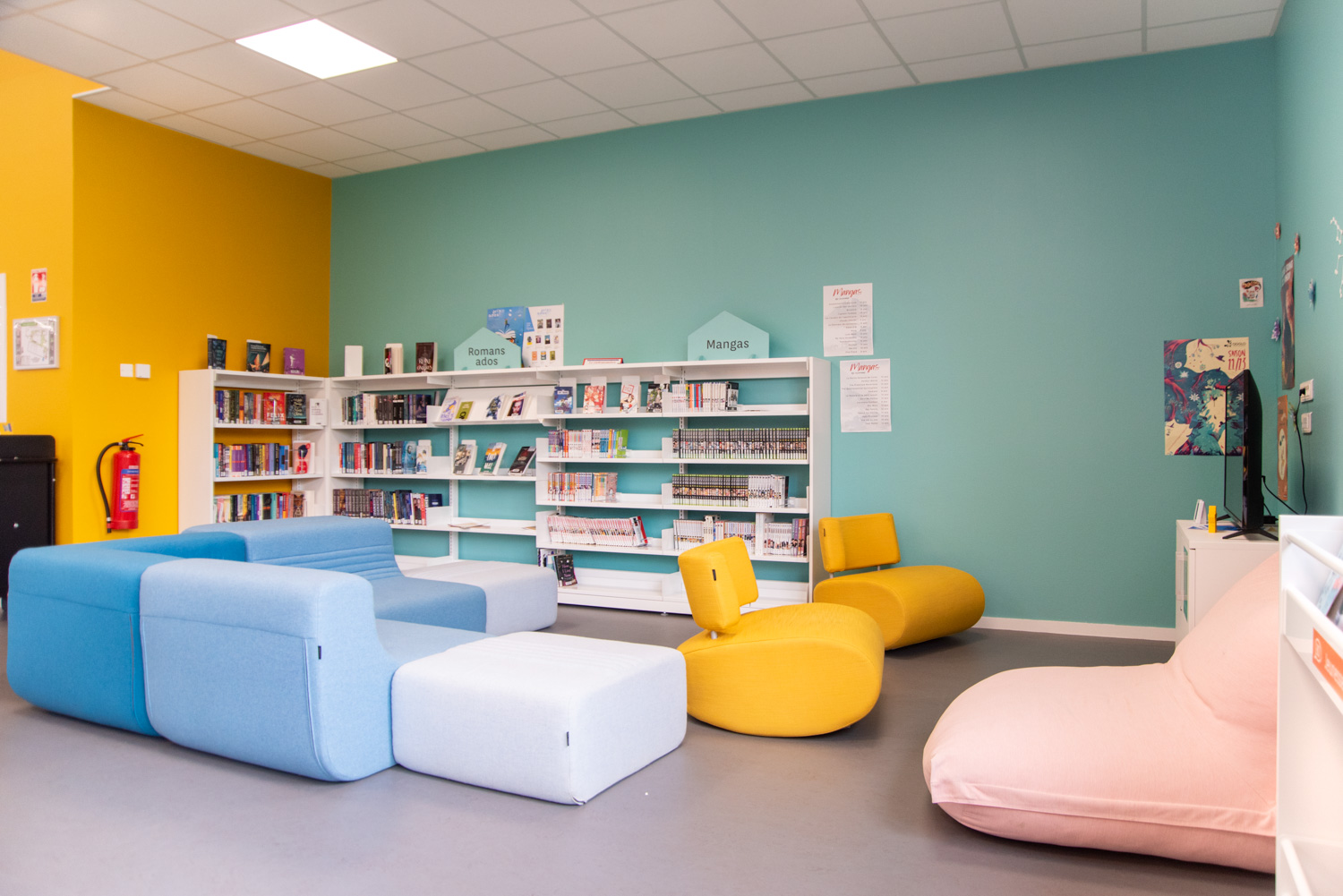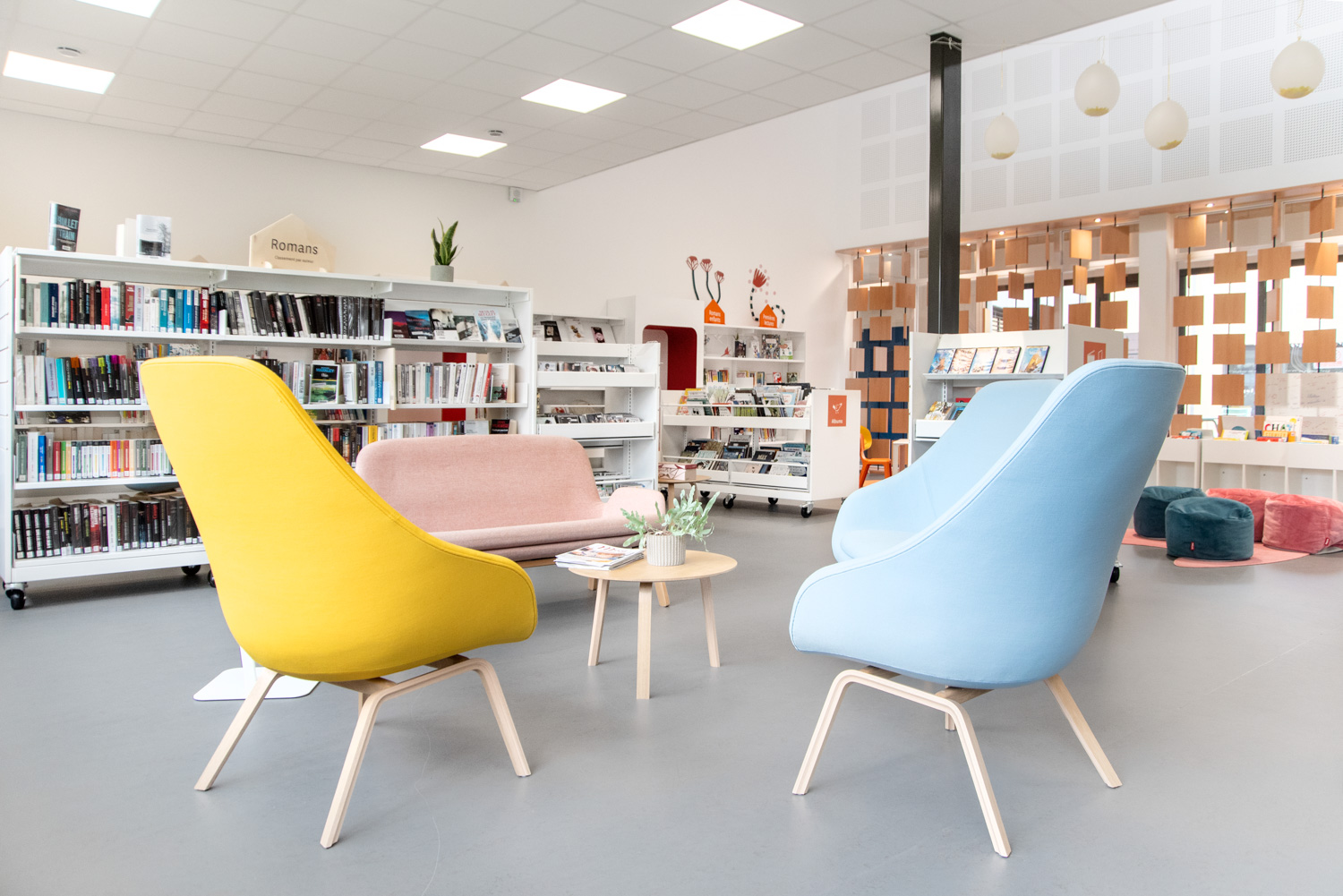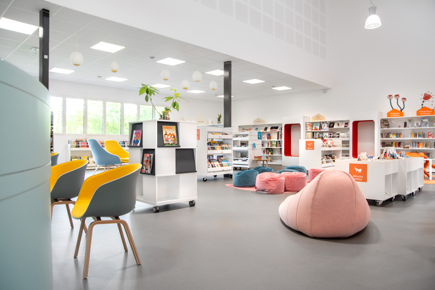 The facility features original seating modules, a vertical Cocoon, and sit-in poufs for sheltered or relaxed reading.