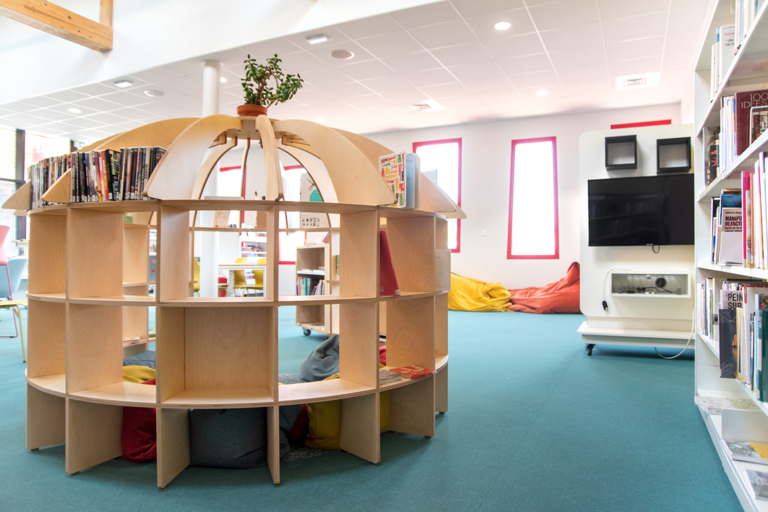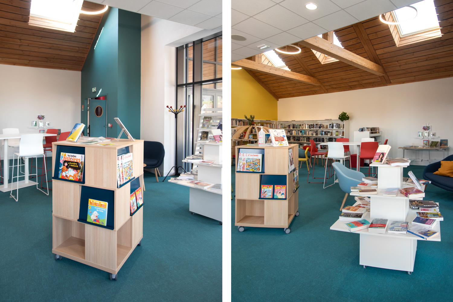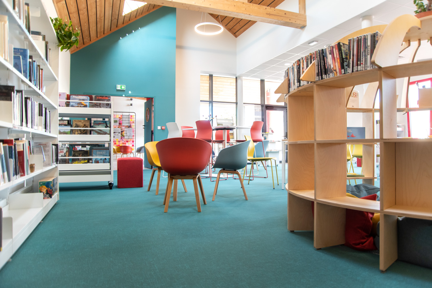 The layout of the media library is the result of a fruitful cooperation between the architect, the municipality, the librarian, and BC Intérieur, where they, as a team, chose the furniture, the colours and the fabrics used. They succeeded in creating a relatively small space (only 100 m²) dedicated to all members of the public: the wooden hut is the refuge for the smaller children, the sofa invites parents to read a story to their children, the high bar is the ideal place where you can meet to study or chat, the connected tables are ideal for working, Fat-boys to curl up in, small comfortable armchairs to drink coffee while reading a magazine… There is room for everyone.