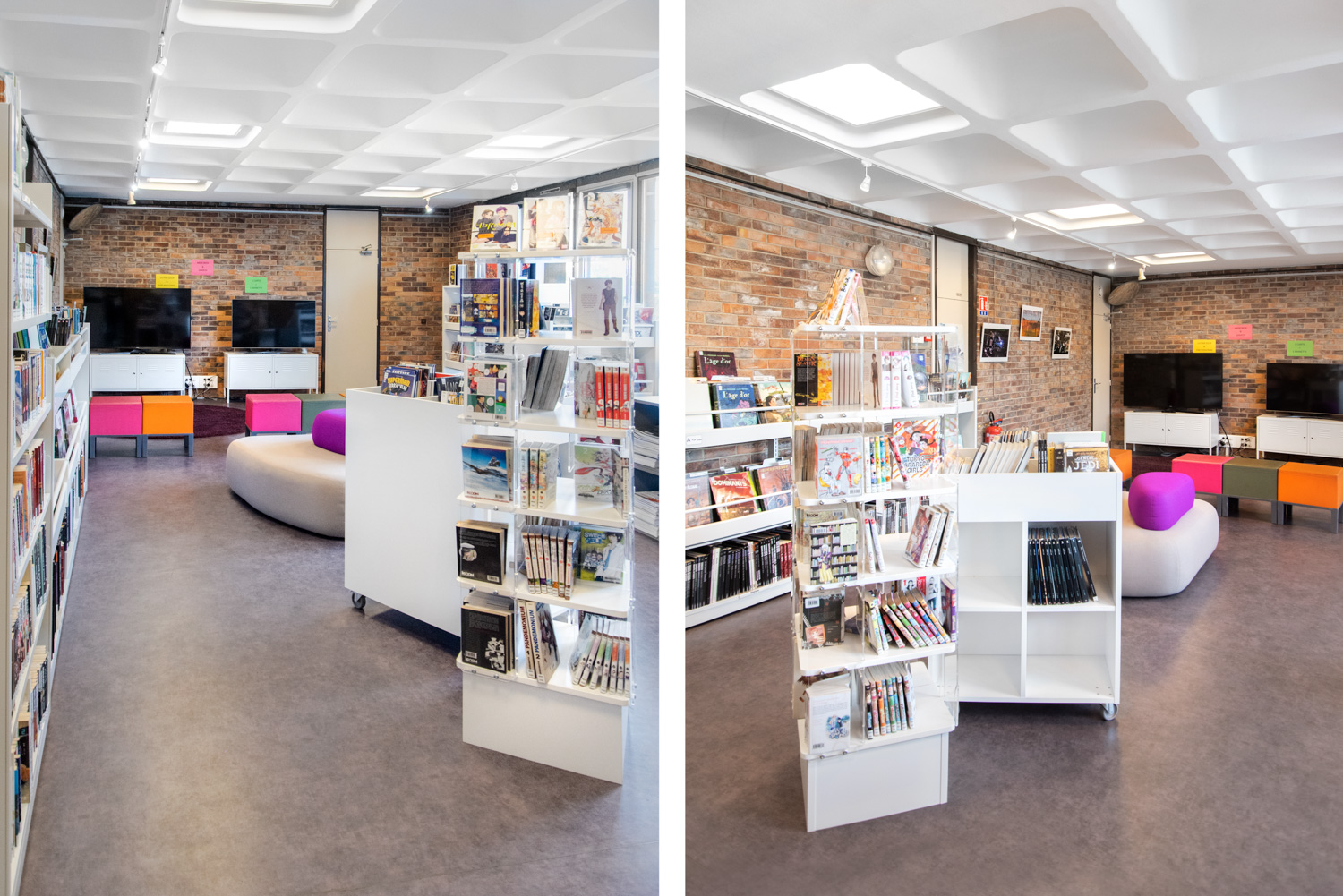This modernisation made it possible to rethink the distribution of space as regard to new uses and the behaviour of the public. The furniture on the three levels, positioned around a central staircase, is predominantly white with a strong colour that personalizes each level.