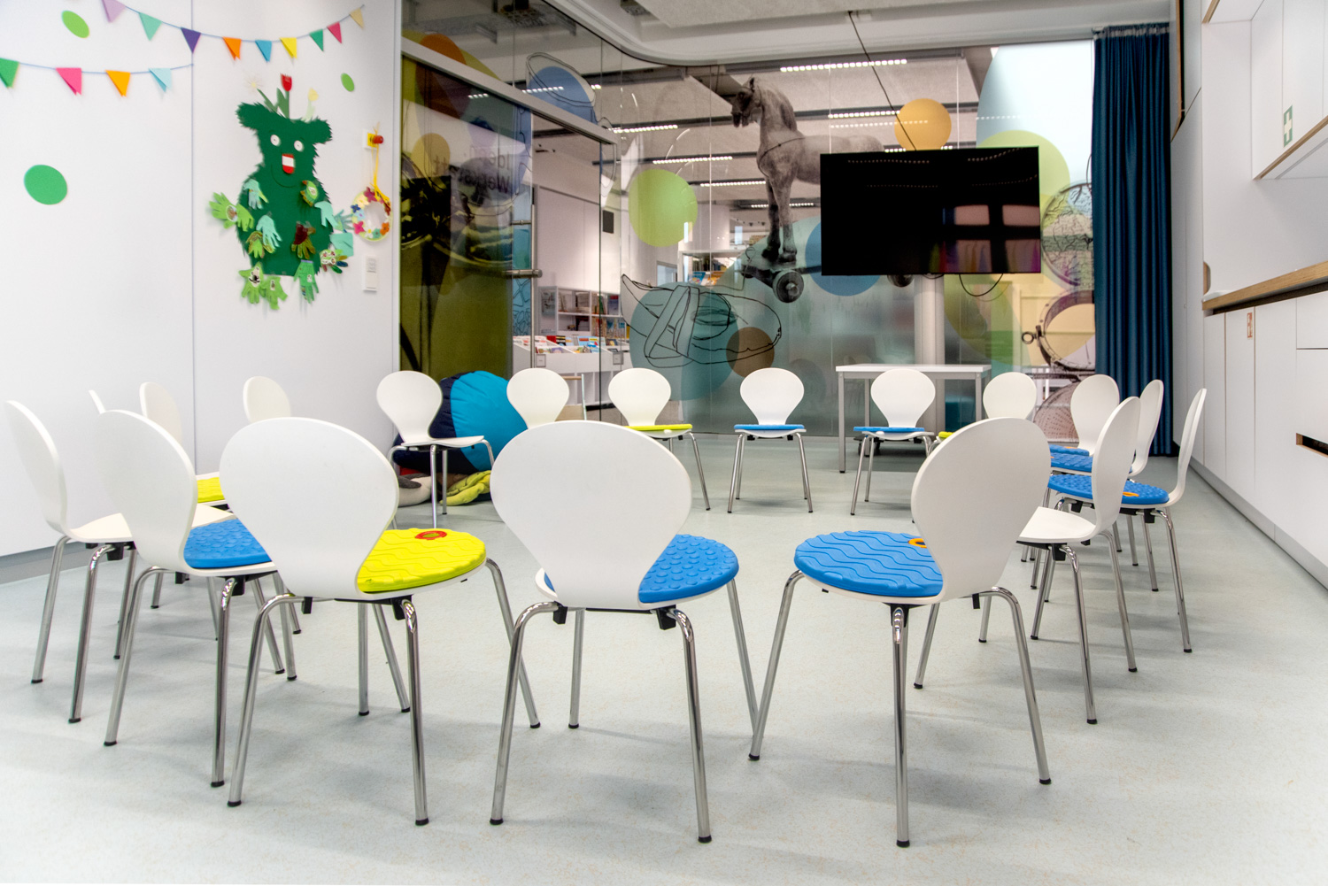 The library attracts all kinds of visitors who come to borrow a book, read a newspaper, play games, or search for other types of media. Schools have access to the library outside of regular opening hours, and the children appear excited about all the opportunities the library offers.