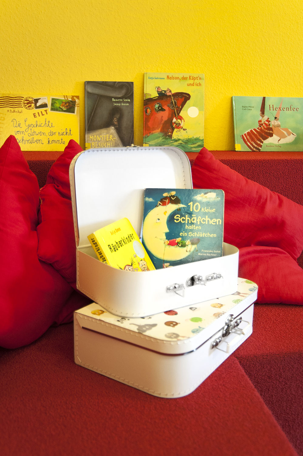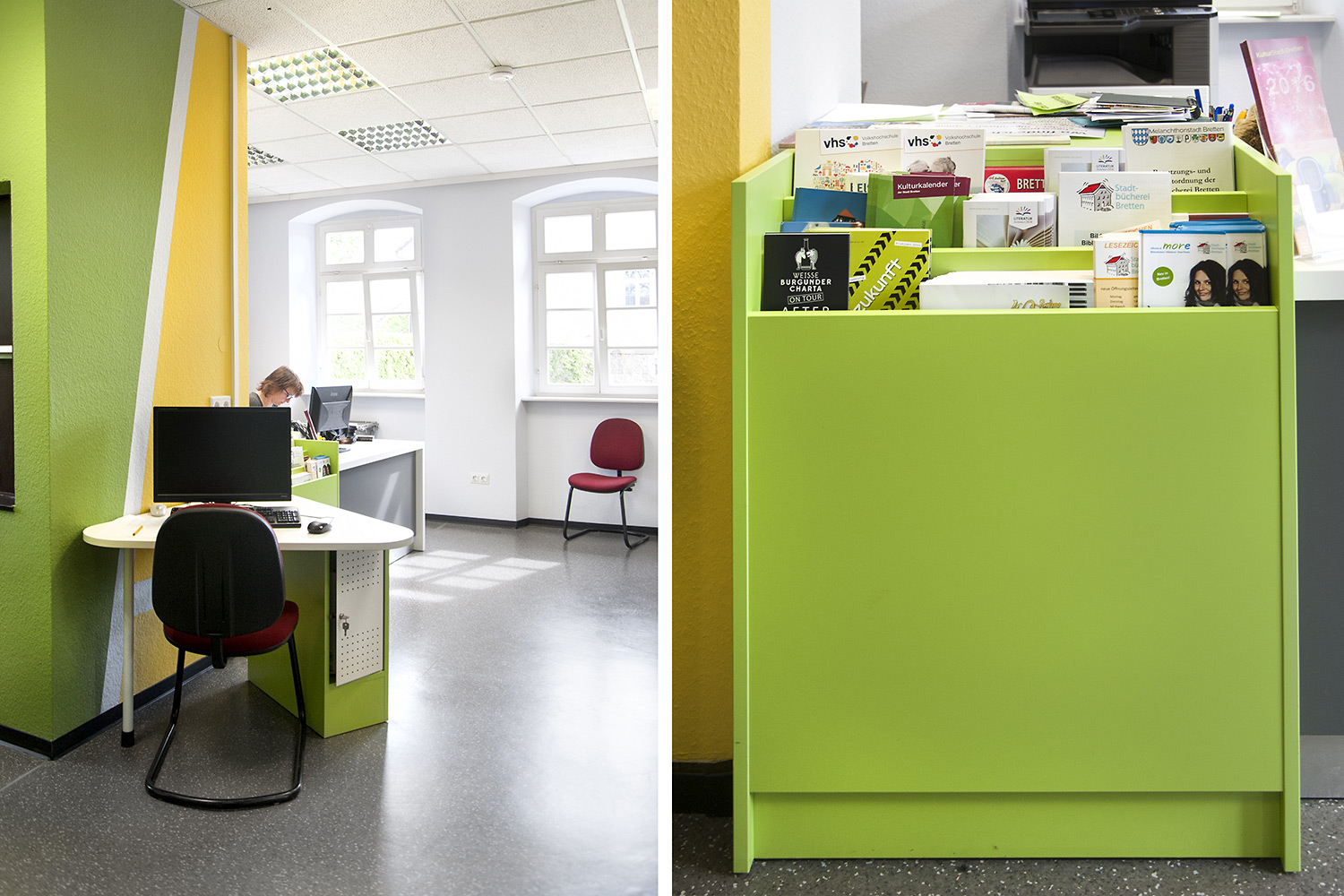 Bretten Public Library is housed in a century-old building, that has now been refreshed with new library interior. Inform counter, Labyrinth display tower and "wild" animal display stands add a new fresh look.