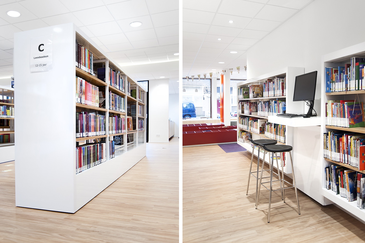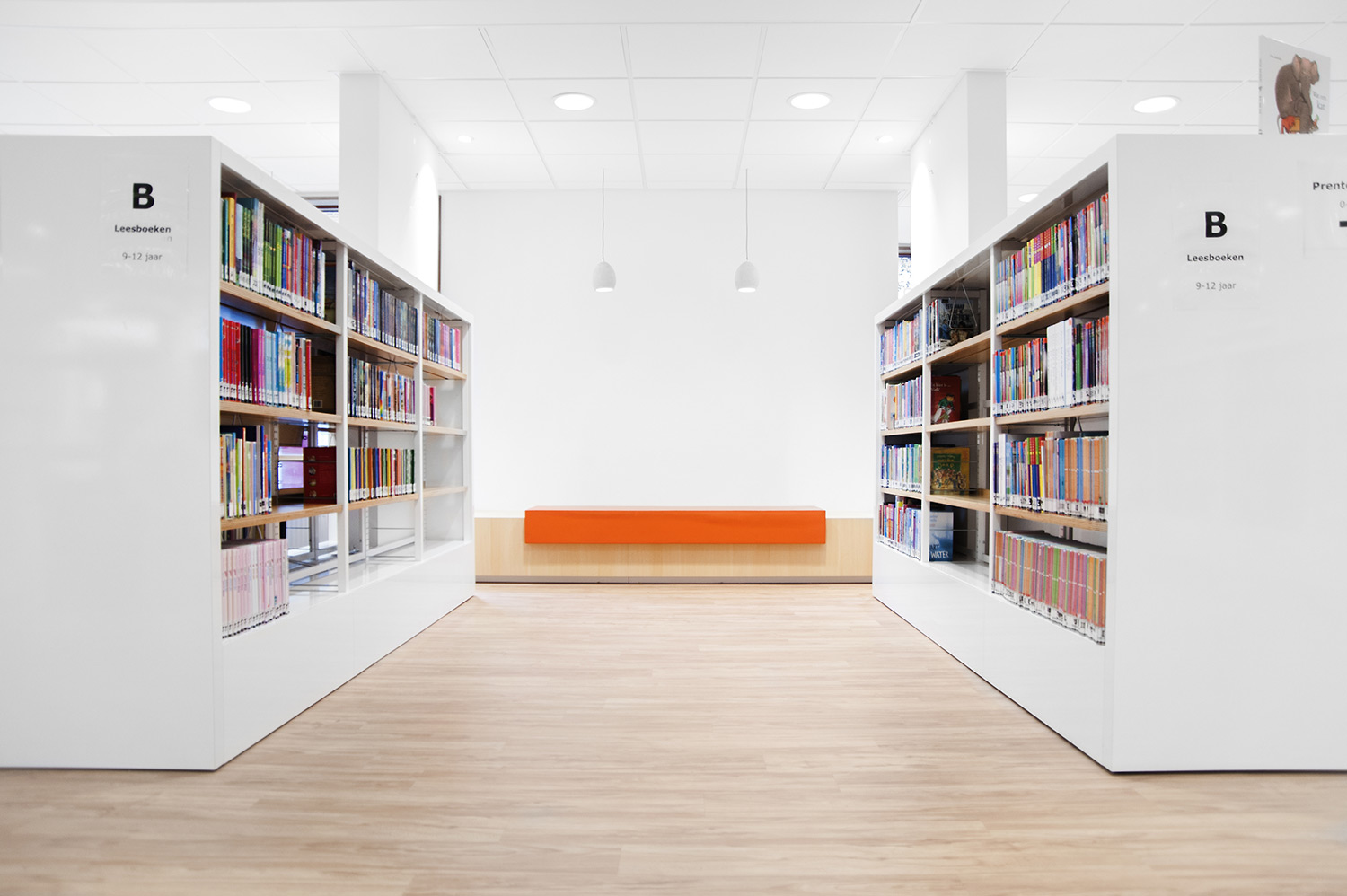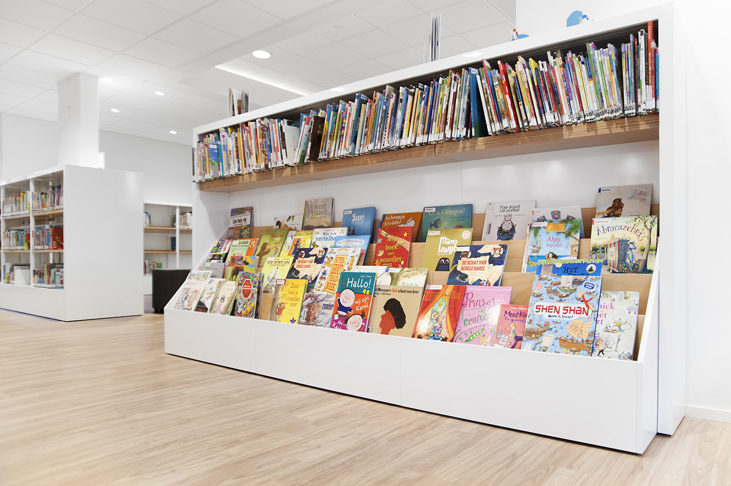 The design of the library has been made by the archtiects +31ARCHITECTS and Millie’s. The interior is spacious and light. It is a combination of custom furniture and standard Uniflex library shelving. But even the library shelving is used in a way so that it almost looks like custom furniture.