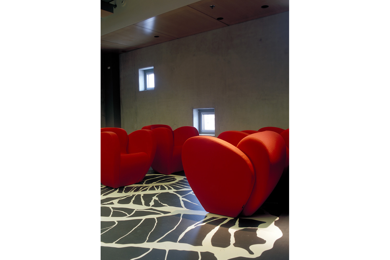 The building exterior serves as a landmark in a new neighborhood, and its boldness brashly continues inside the building. Interior designer Aat Vos has used light flows and materials in an innovative way.