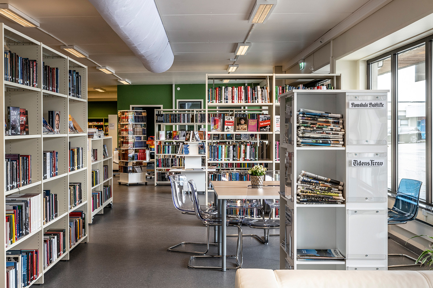 In autumn 2022, the newly renovated library in Hustadvika, Eide, reopened with a blend of new shelving and reused furniture. The library features vibrant colours and an open, bright environment, thanks to its large windows and light-toned furnishings.