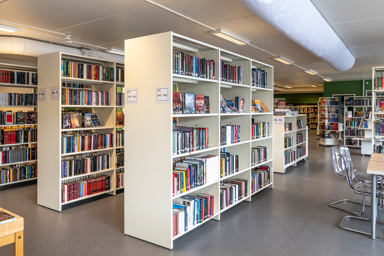 The library aimed for a harmonious mix of new, functional shelving and counters, complemented by the reuse of existing furniture and book displays. Our Norwegian design team BS Eurobib has managed the layout and colour schemes, collaborating with a dealer to supply shelving systems, counters, display towers, book trolleys and more.
