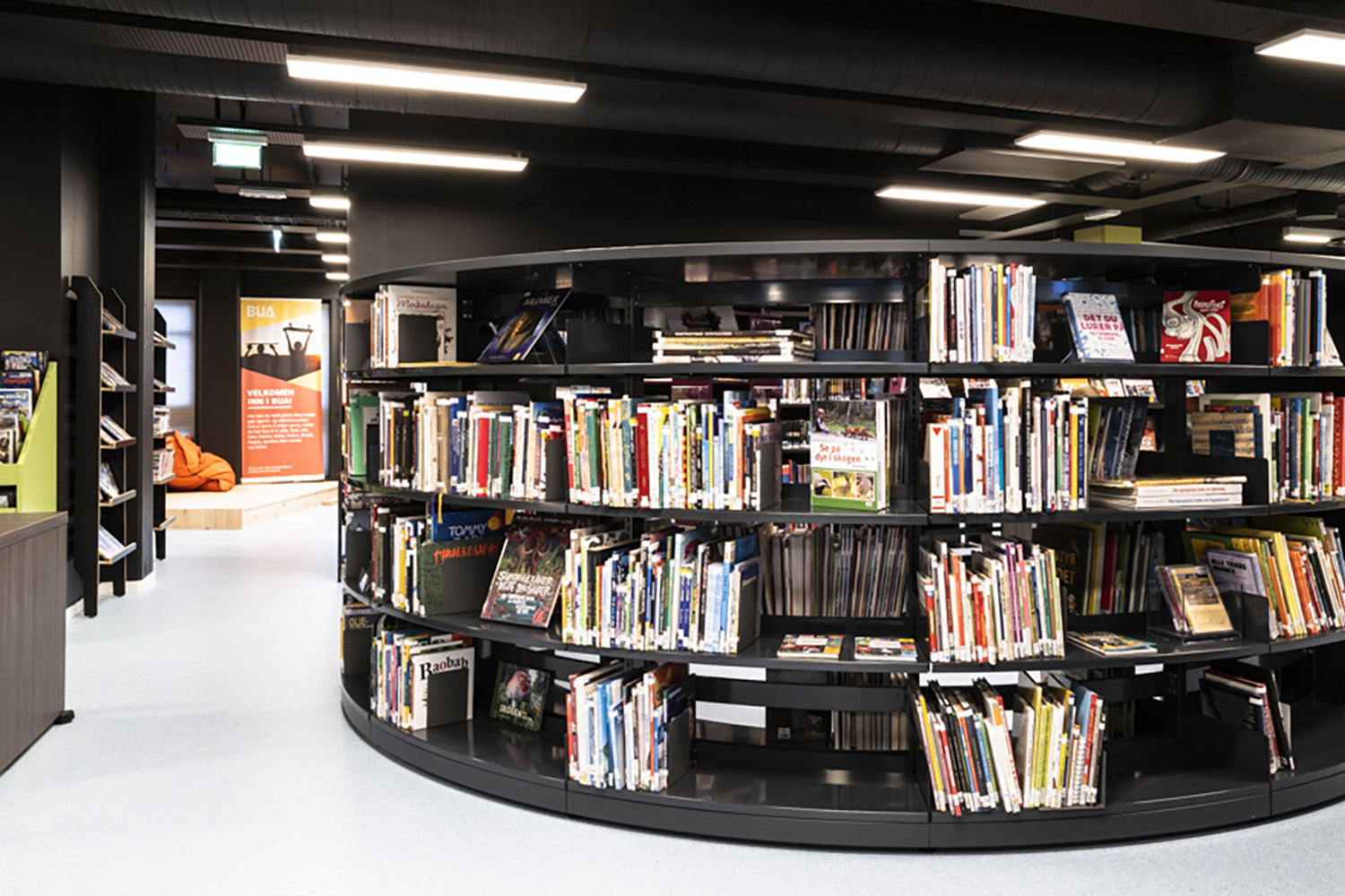 In 2020 the municipalities Meland, Lianås, and Radøy merged to the new Alver municipality, and the process of a shared public library began with three departments. In the middle of the Knarvik Senter which is located just outside Bergen, the new Strila Library now constitutes a holistic collection for the benefit of the new large municipality.