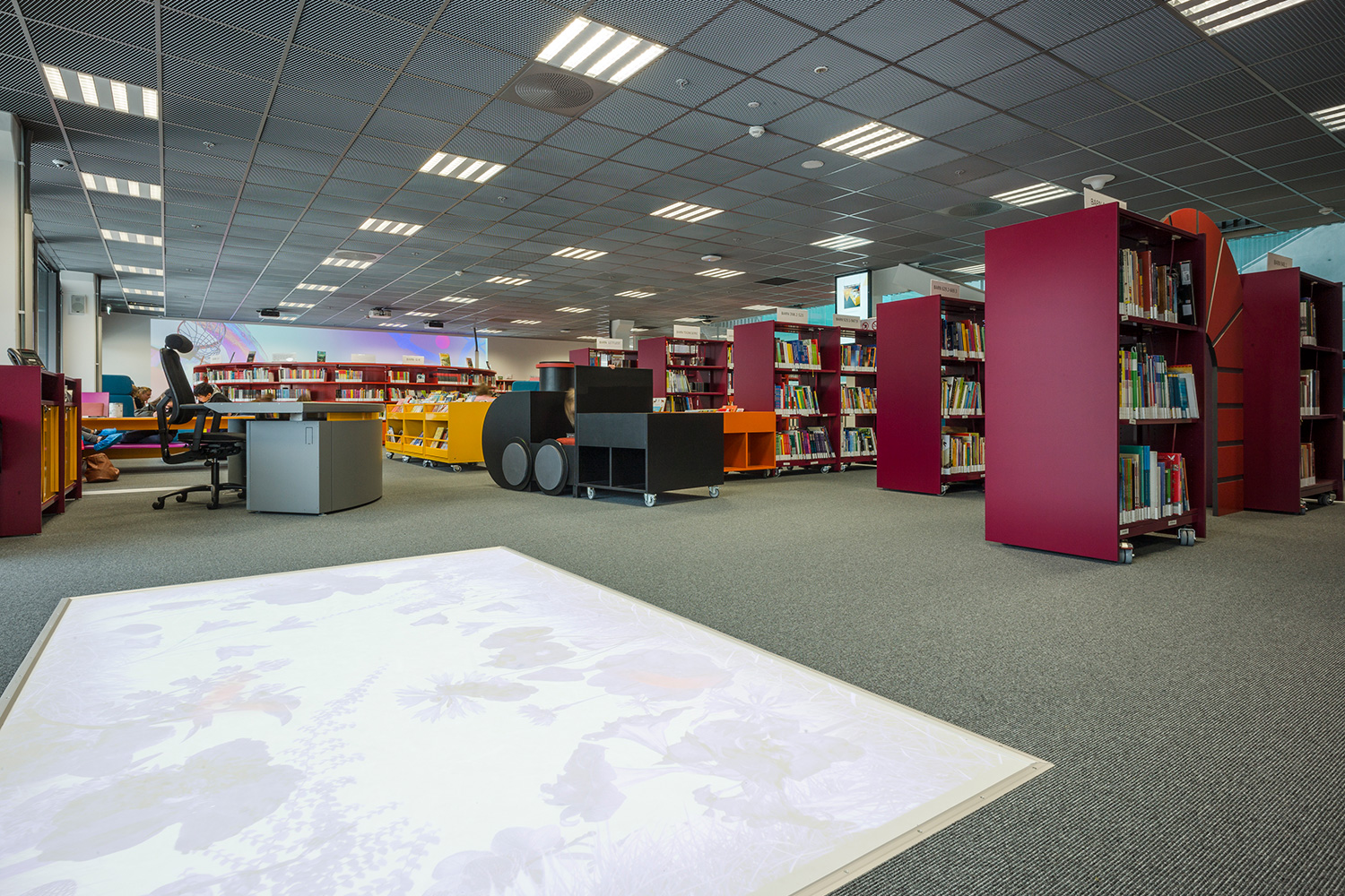 There are many interactive opportunities for users of the new library that inspire to learning and arouse the curiosity of children and adults alike. It’s mainly about playing for knowledge with interactivity as a starting point and reading the target. The interactive floor invites you to play and learn and spreads life and activity throughout the library. A big, visual panoramic screen shows scenes from the book that is read aloud to the audience. In the music department you find an Audio Factor for music experiences and throughout the library you find digital signage and book machines with information on available books.
