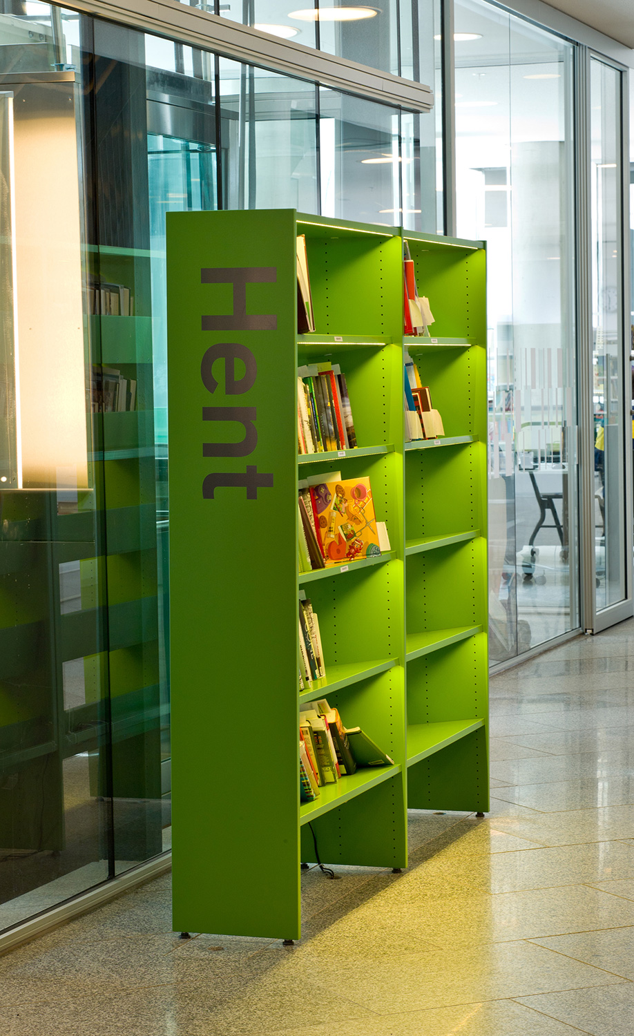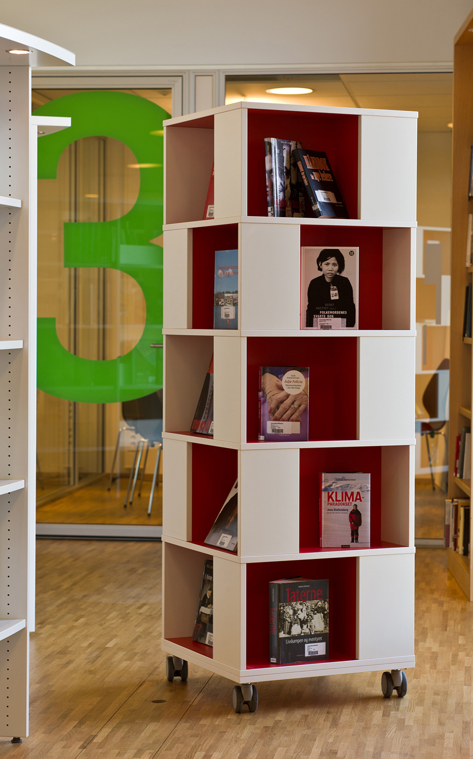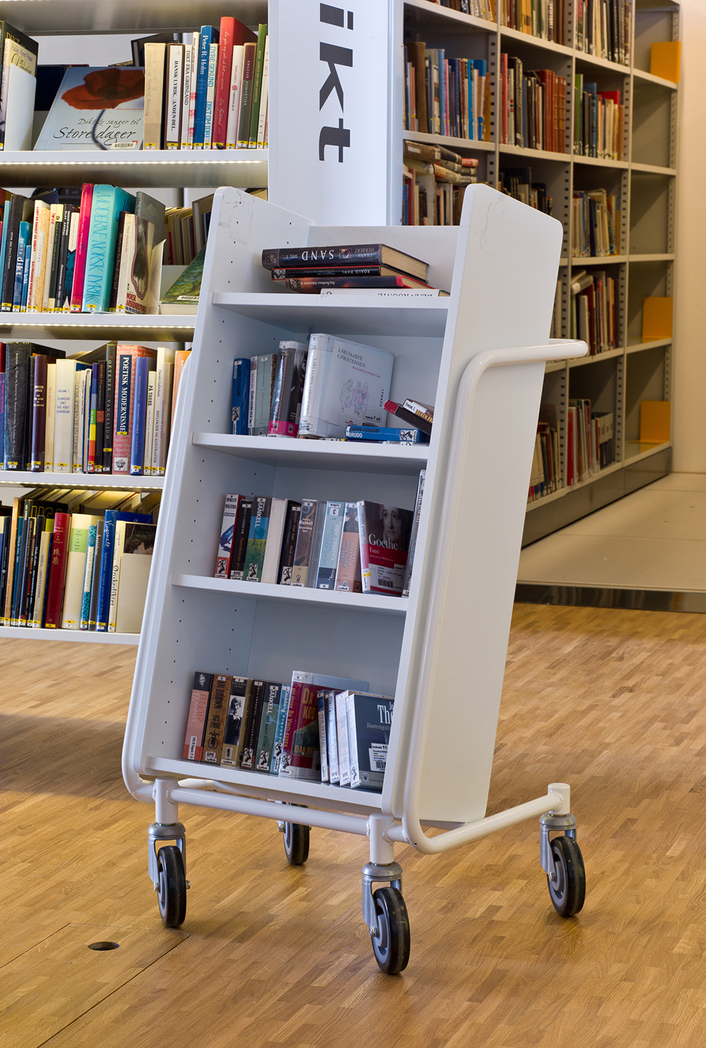 The architects were challenged by the library manager Berit Bjørkild to design her dream shelf. The mission was to design a shelving system with shelves, which could “sell” the books, inspired by the commercial bookstores. Customized shelves, lighting and unique interior solutions should help presenting the cover of the books in an optimal way. The customized shelves tilt slightly backwards, making it possible to display the front of the books without the risk of books falling off.