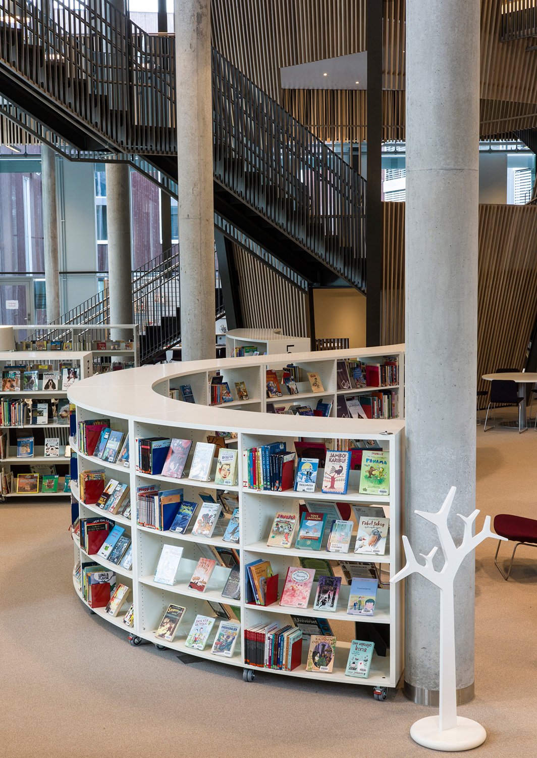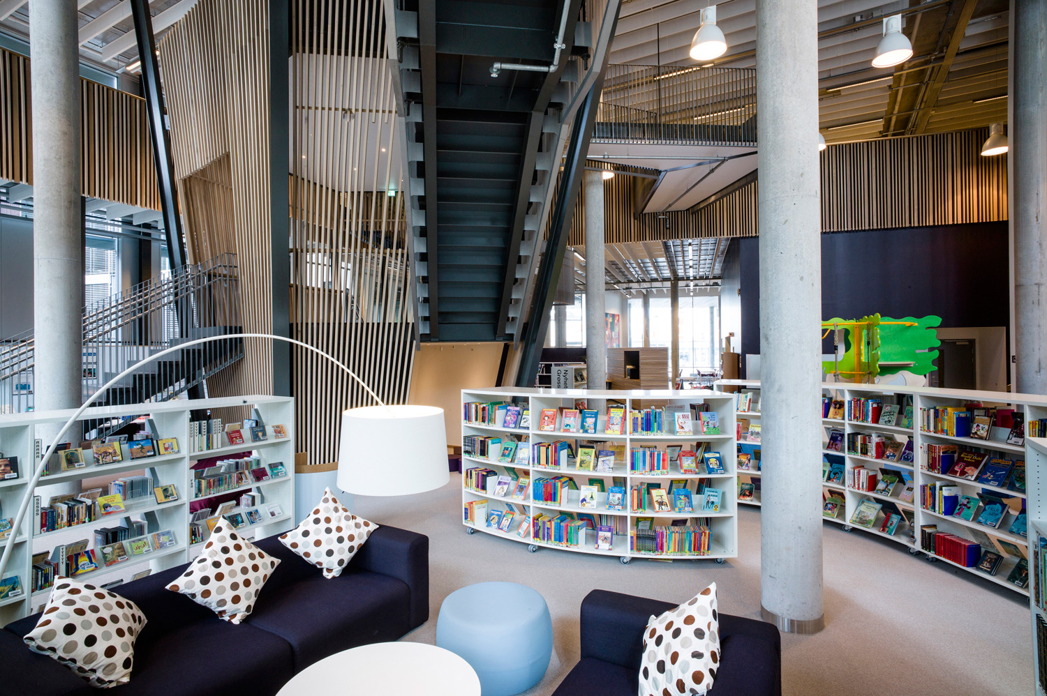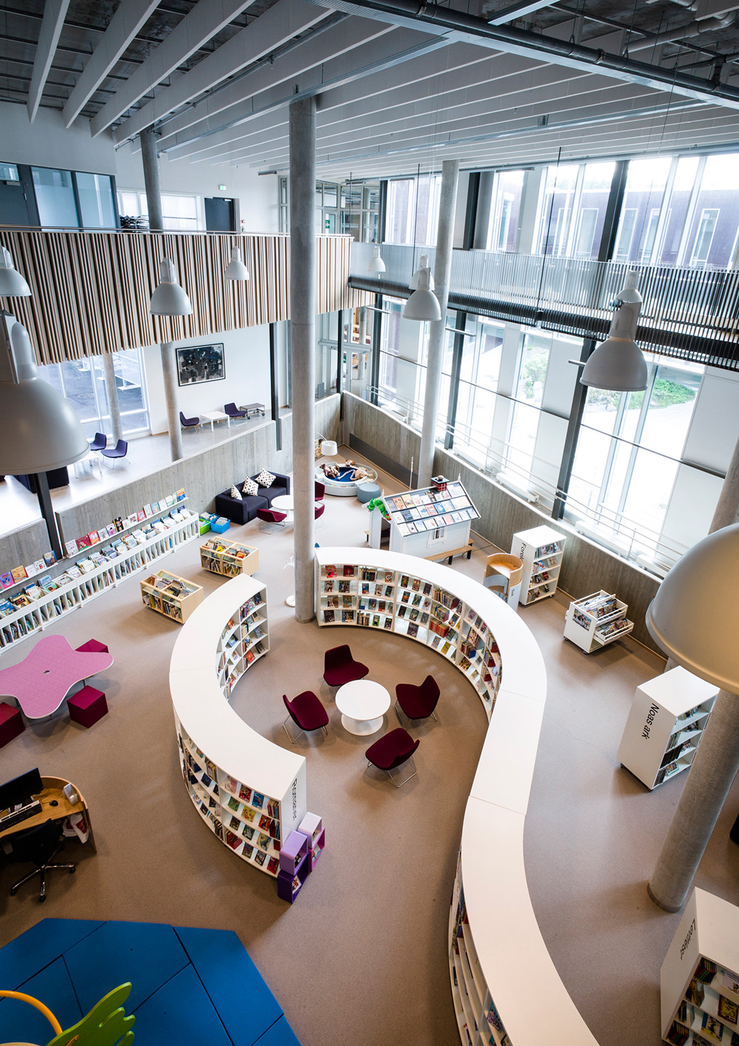 With its organic shapes and soft curves, this is a library distinguished by new thinking. This is not only reflected in the architecture but also in the shelving that follows the organic form. There are plenty of study desks and comfortable seating, information points and self-service stations, making this library a user’s delight.