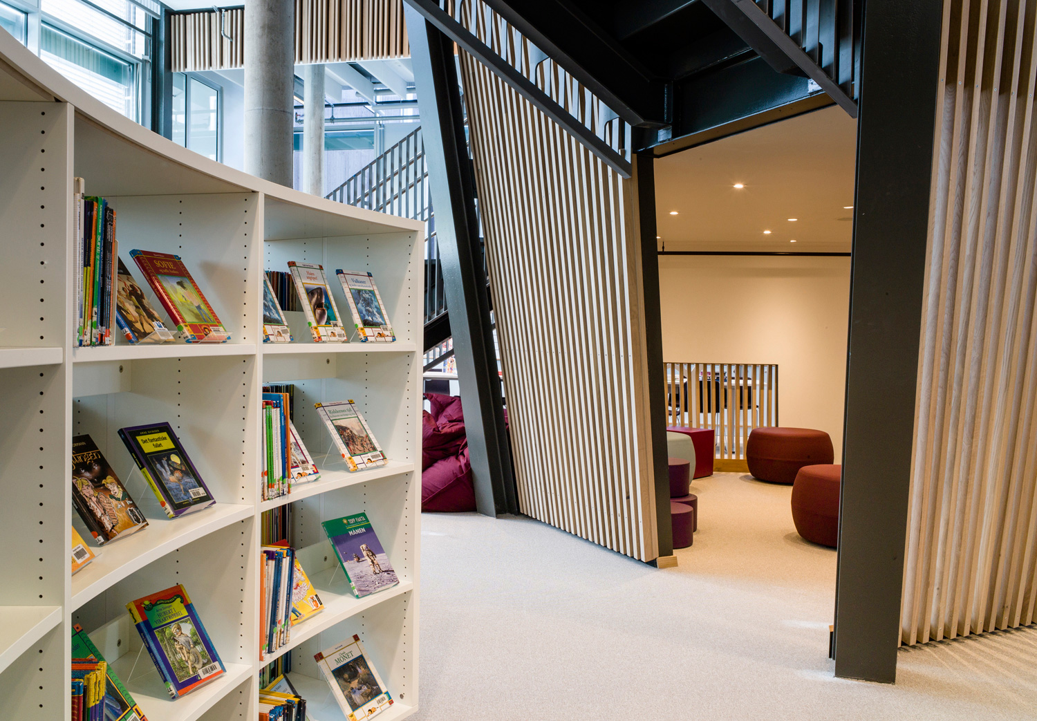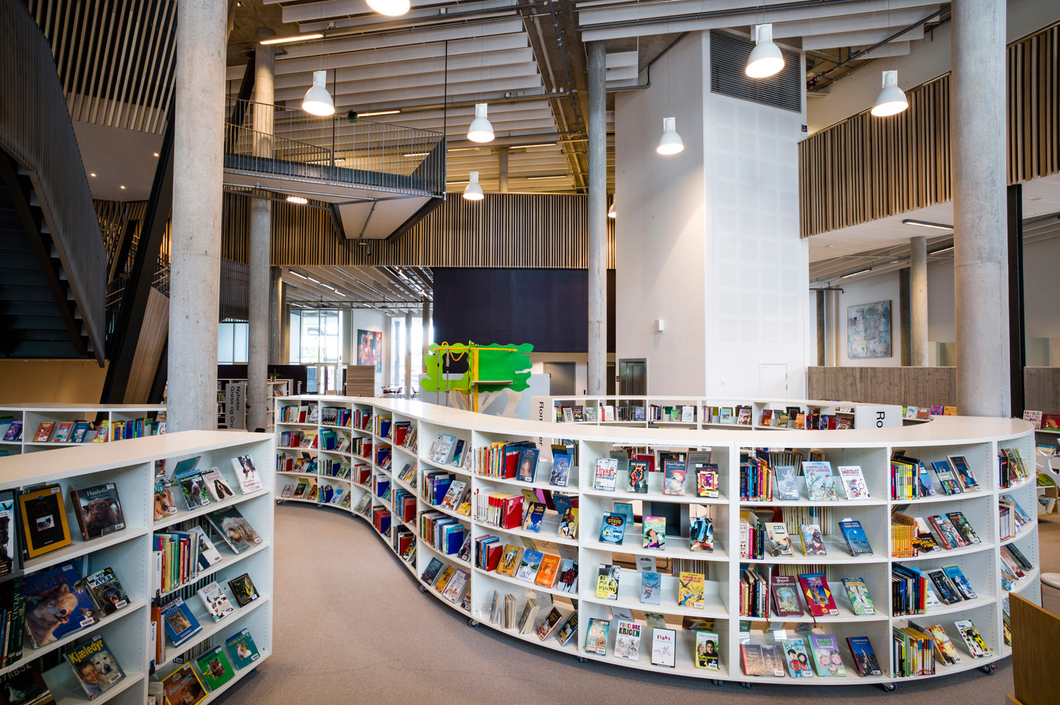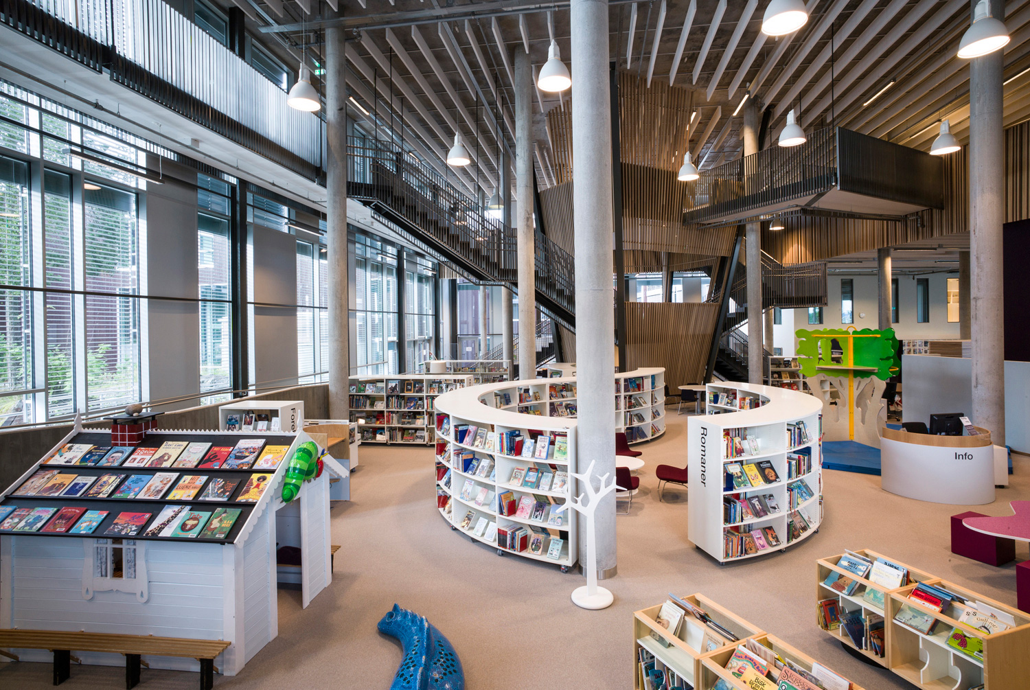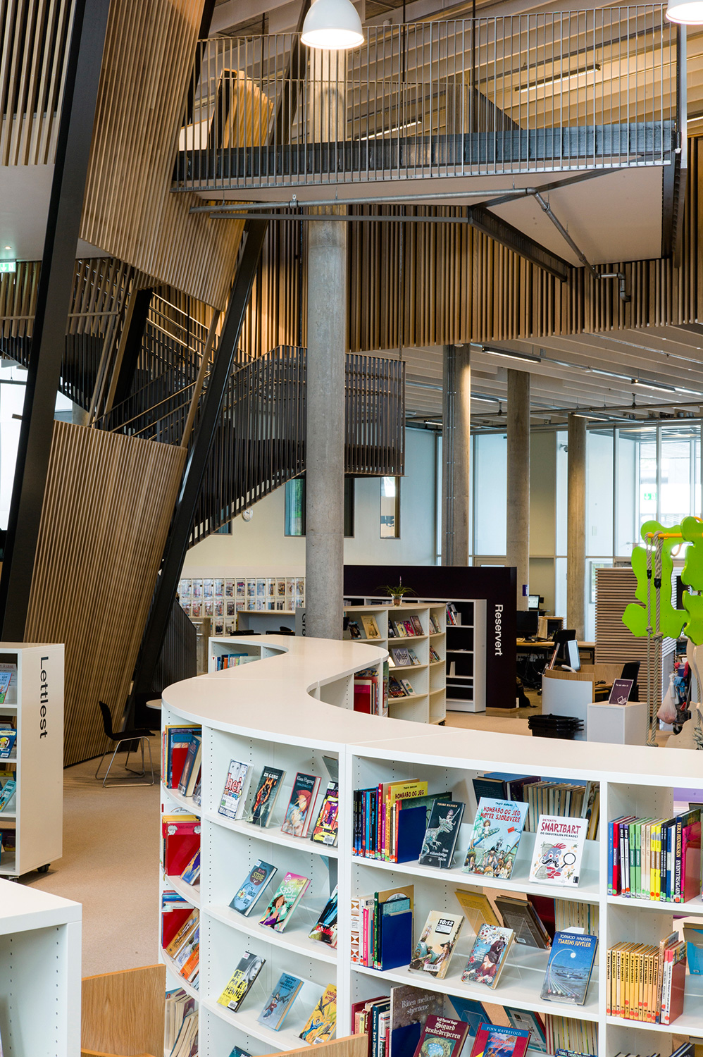 With its organic shapes and soft curves, this is a library distinguished by new thinking. This is not only reflected in the architecture but also in the shelving that follows the organic form. There are plenty of study desks and comfortable seating, information points and self-service stations, making this library a user’s delight.